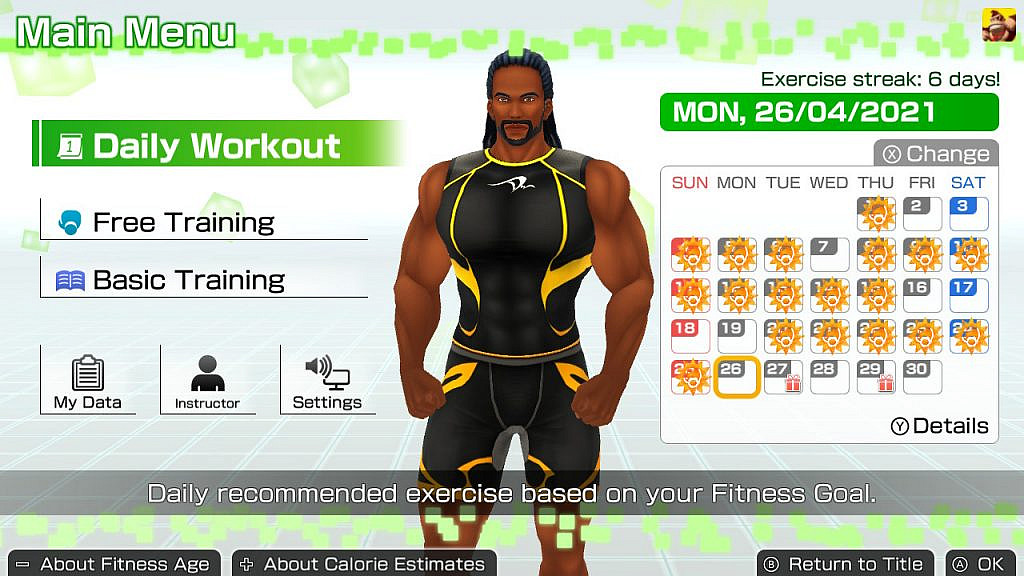The game doesn’t give much variety when you start the game. The game recommends doing the daily exercise, which can be modified from 15 minutes to 45 minutes. You can also choose the fitness goal and body target. Then the game makes you a workout session that you have to complete. The workout is separated into multiple parts, including stretching if you want. Every part has different movements and music playing in the background. You perform the actions by punching, stepping, blocking, or dodging in the rhythm of the music and instructions. Punches and blocks felt well optimized, but I think I missed steps and dodges multiple times because they weren’t configured to the joy-cons perfectly. Once the workout is done, you get to stamp the current day’s workout to the in-game calendar. Then the game shows how many calories you have burned and how many punches you have done.