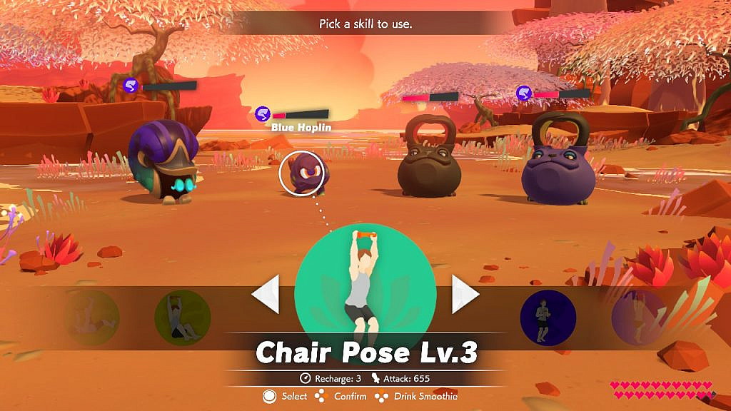 The jogging levels are also filled with monsters. When you encounter them, the game turns into a turn-based RPG combat, where you use different moves to deal damage to the enemies. There are four categories of moves: arms, legs, abs, and yoga. There are over 40 different moves that you unlock while playing. Some of the moves target only one opponent, while others target three or five. Some of the moves are easier than others, for example, you could damage five enemies by shaking your hips or doing multiple mountain climber reps. There are also boss fights, but sadly Dragaux is half of these encounters which felt a little bit repetitive. Combat itself feels well done because it never felt too hard or easy. The wide variety of moves and enemies keeps these encounters interesting and versatile.