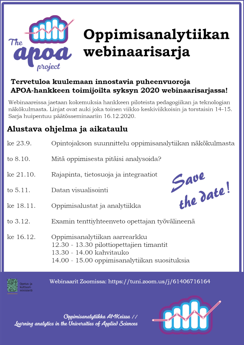 Analytiikkakahveilla kuullaan APOAn asiantuntijoiden ja opettajien puheenvuoroja ohjauksesta, pedagogiikasta, arvioinnista ja teknologiasta oppimisanalytiikan ollessa keskeisessä roolissa. Sarja huipentuu joulukuiseen Oppimisanalytiikan aarrearkku -seminaariin 16.12.2020 klo 12.30 – 15.00. Tilaisuudet tallennetaan.