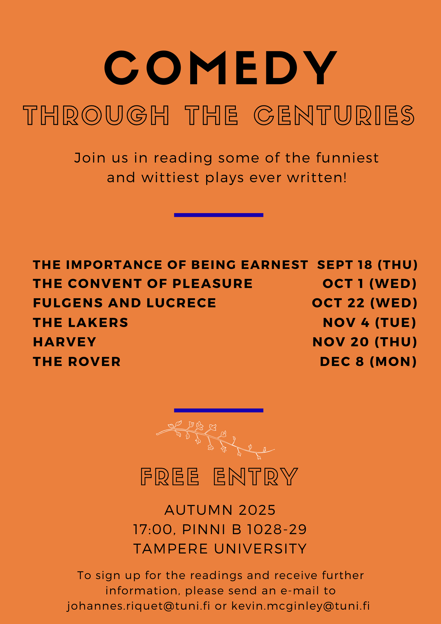 This series of events allows you to discover the world of anglophone comedy from the Middle Ages to the 21st century. In each session, we will jointly read one of the plays listed below. The selection includes famous plays as well as little-known gems. All participants are invited to act as readers, but you are also welcome to simply come along and enjoy the plays.