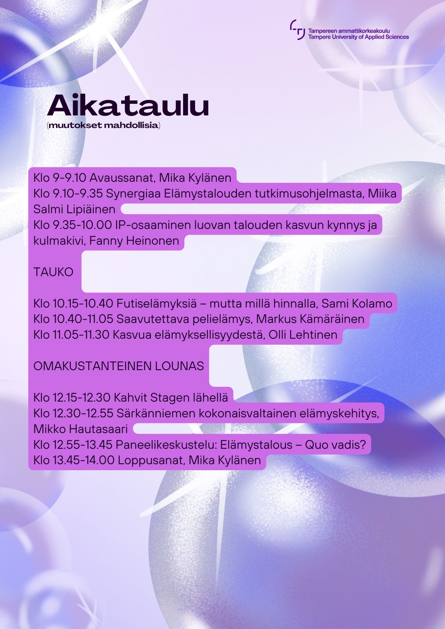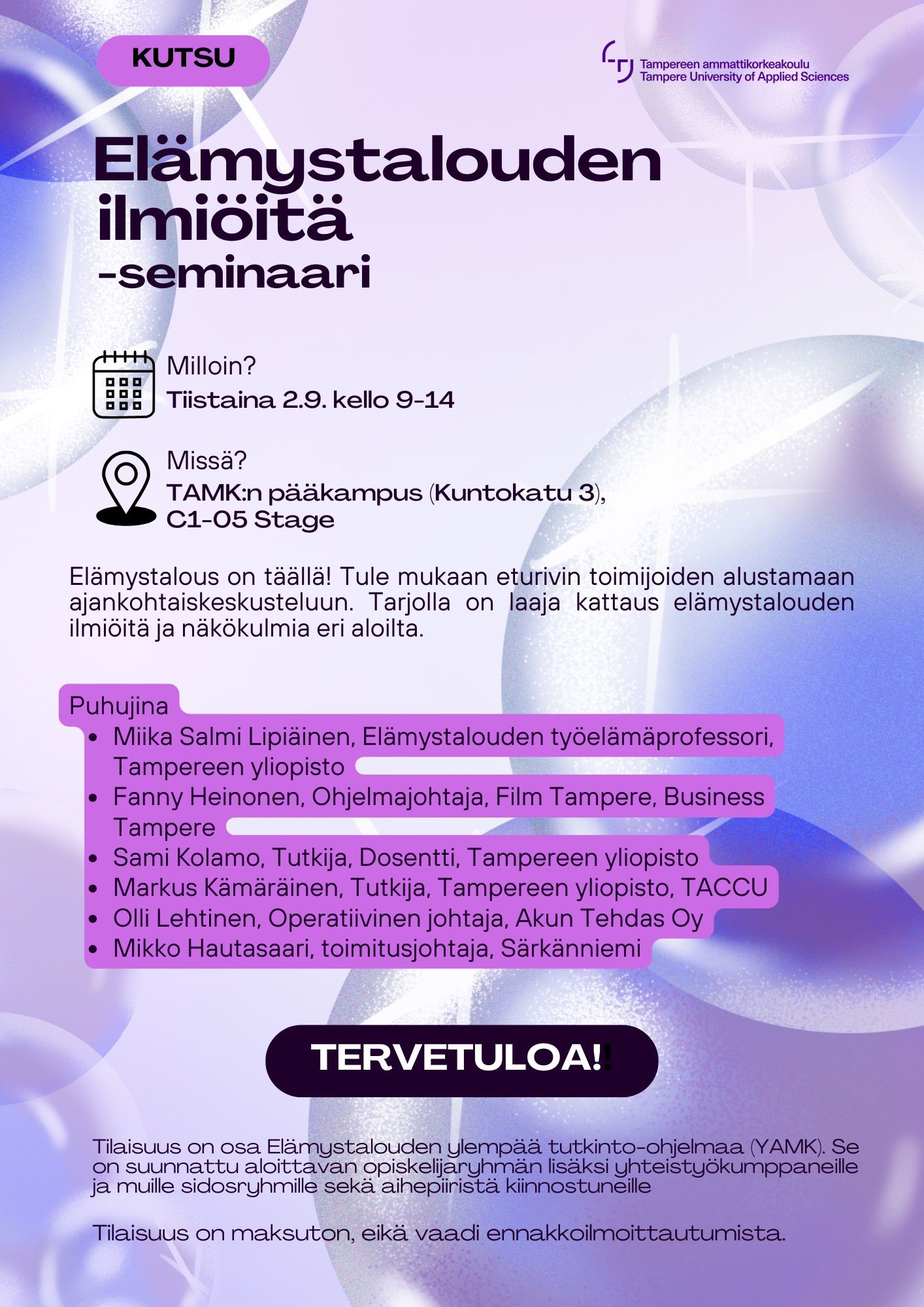 Tilaisuuden tarkempi ohjelma ja aikataulu on julkaistu ohessa. Puhujina ovat elämystalouden työelämäprofessori Miika Salmi Lipiäinen, tutkija Sami Kolamo ja ohjelmajohtaja Fanny Heinonen, tutkija Markus Kämäräinen, operatiivinen johtaja Olli Lehtinen ja toimitusjohtaja Mikko Hautasaari. Tilaisuuden juontaa lehtori Katri Varjos. Tilaisuus on osa Elämystalouden ylempää tutkinto-ohjelmaa (YAMK). Se on suunnattu aloittavan opiskelijaryhmän lisäksi yhteistyökumppaneille ja muille sidosryhmille sekä aihepiiristä kiinnostuneille.