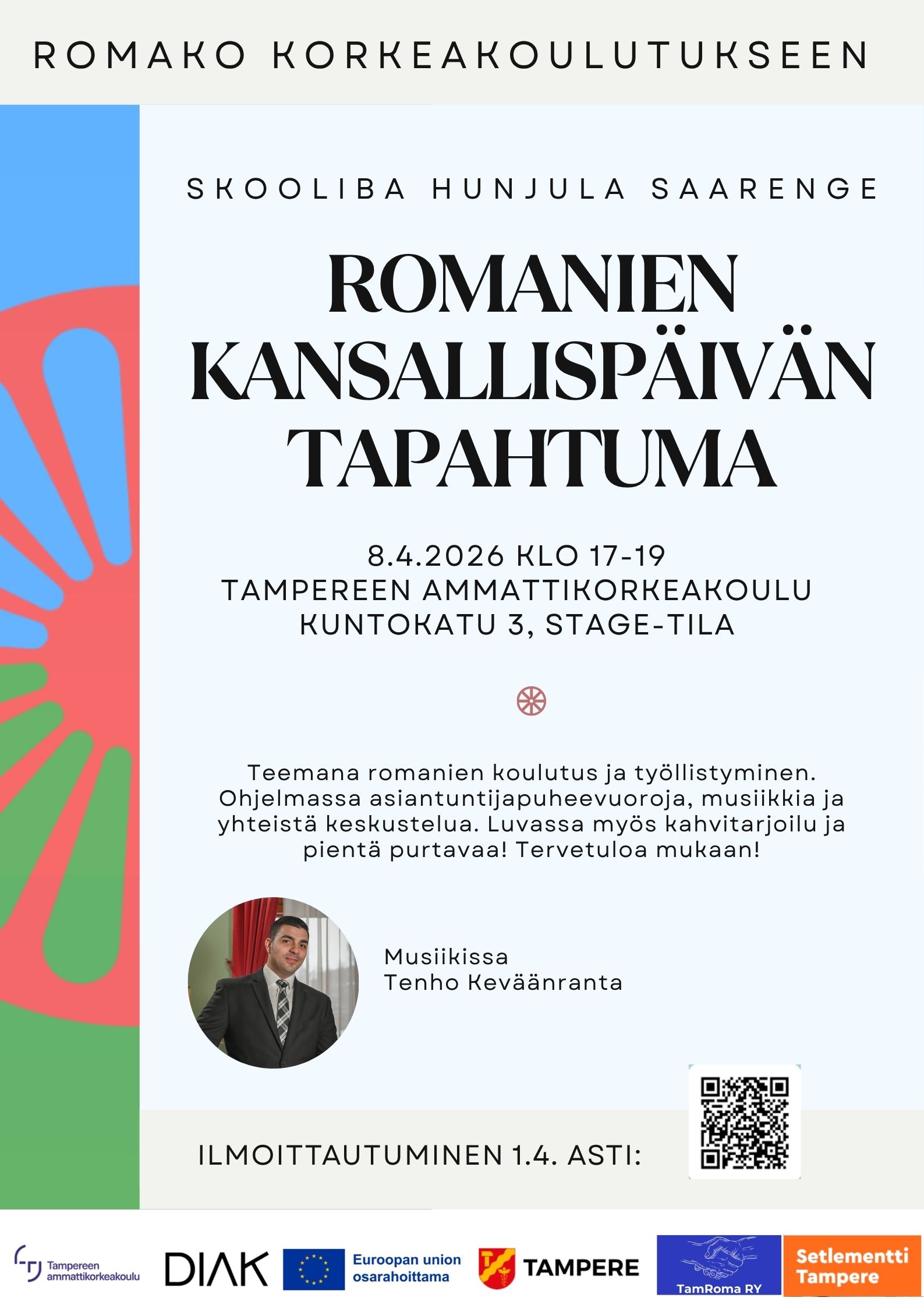 Romanien kansallispäivän tapahtuma järjestetään tiistaina 8.4.2026 klo 17–19 TAMKin pääkampuksen Stage-tilassa (Kuntokatu 3). Tapahtuman teemana on romanien koulutus ja työllistyminen.