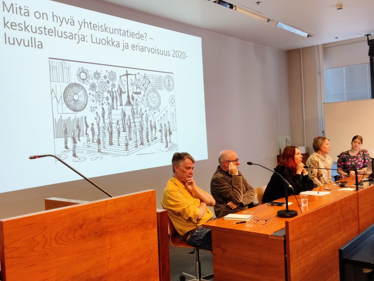 Eriarvoisuus, joka voi ilmetä esimerkiksi tuloeroissa, hyvinvoinnissa, koulutuksessa ja kulutustottumuksissa, on viimeaikaisen kehityksen valossa kasvussa. Klassinen yhteiskuntatiede käsitteli eriarvoisuuden kysymystä yhteiskuntaluokan näkökulmasta. Yhteiskuntaluokan käsitteen merkitys vaikuttaa kuitenkin kadonneen tai hajonneen osiin nykyisessä yhteiskuntatieteellisessä keskustelussa. Keskustelusarjan toinen kokoontuminen kysyi, millaista on eriarvoisuus 2020-luvulla sekä mikä on yhteiskuntaluokan käsitteen merkitys sen analyysissä. Keskustelua pohjusti emeritusprofessori Harri Melinin alustus klassisesta luokan käsitteestä ja luokkatutkimuksesta. Paneelikeskustelussa luokasta ja eriarvoisuudesta keskustelivat Harri Melinin lisäksi professori Semi Purhonen (sosiologia), apulaisprofessori Satu Ojala (sosiaalipolitiikka) sekä apulaisprofessori Hanna Ylöstalo (sukupuolentutkimus). Keskustelun juonsi sosiologian väitöskirjatutkija Alma Onali ja yleisön palaute tilaisuudesta oli positiivista.