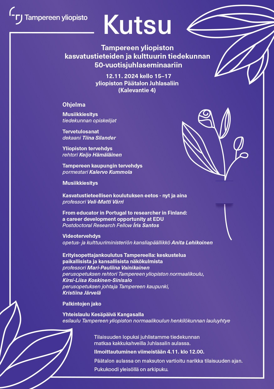 Tiedekunnan koko henkilöstön 50-vuotisjuhla pidettiin 12.11.2024 klo 15 päätalon juhlasalissa. Ohjelmassa oli puheita, musiikkiesityksiä, palkitsemisia sekä juhlakahvit.
