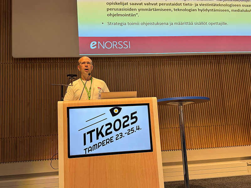 Tampereen yliopiston normaalikoulu mahdollisti henkilöstölleen laajan osallistumismahdollisuuden koulutustapahtumaan. Nyt mukaan pääsy olikin aiempaa helpompaa, sillä tapahtuma järjestettiin Tampere-talolla. Aiemmat vuodet ja vuosikymmenet ITK-konferenssi on järjestetty Hämeenlinnan Aulangolla. Tampereen yliopiston normaalikoulu oli jälleen hyvin näkyvästi esillä myös esityksissä, sillä Janne Nissinen, Mikko Horila ja Tuomo Tammi olivat puhumassa mm. uudesta tietostrategiasta, osaamistasokuvauksista , digipassista ja opettajan tekoälyoppaasta. Ja olipa myös Norssin kuudesluokkalaisia rohkeasti esillä haastateltavina omista tekoäly-näkemyksistään.