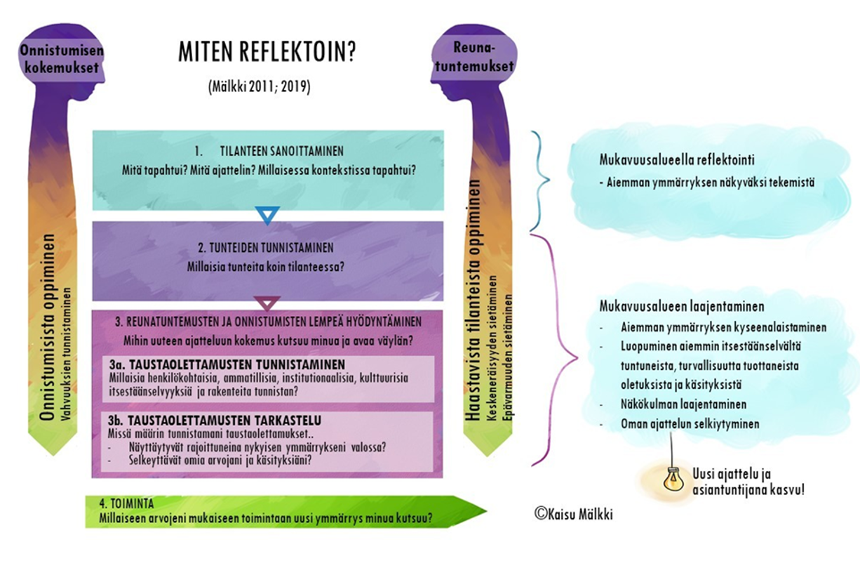 Oman työn reflektointi suullisesti ja kirjallisesti kuuluu keskeisesti kaikkiin ohjattuihin opetusharjoittelujaksoihin. Mälkki (2011, 2019) on koonnut reflektioprosessin seuraavaan kuvioon.