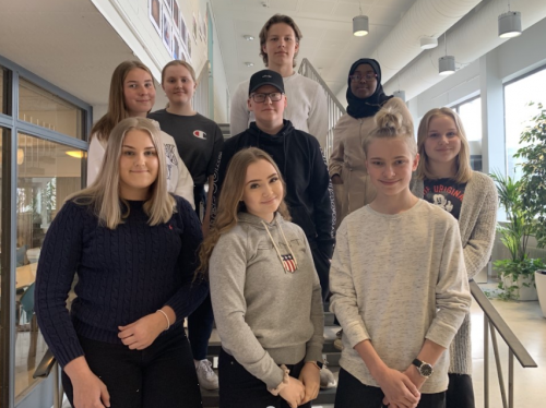 Tässä osa yläasteen oppilaskunnan hallituksesta lukuvuonna 2018-2019. Kuvassa myös puheenjohtaja Maria keskellä alhaalla, sihteeri Riho Toom ylhäällä keskellä ja varasihteeri ja -puheenjohtaja Sakia Omar oikealla ylähäällä.