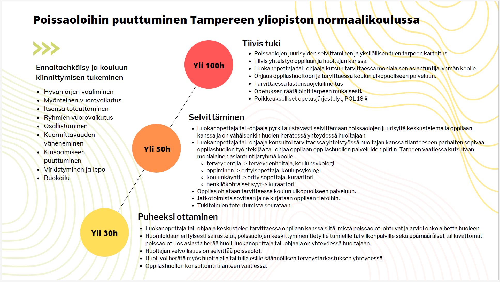 Opetuksen järjestäjä seuraa oppilaiden osallistumista opetukseen. Jokaisella koululla tulee olla toimintamalli poissaolojen seuraamisesta, niistä ilmoittamisesta ja niihin puuttumisesta (Perusopetuksen opetussuunnitelman perusteet 2014). Tämä on normaalikoulun päivitetty malli, joka koskee poissaolojen ennalta ehkäisyä, seuraamista ja niihin puuttumista.
