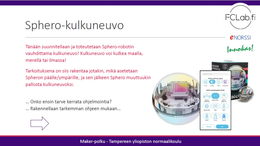 Tässä tehtävässä suunnitellaan ja toteutetaan Sphero-robotin vauhdittama kulkuneuvo! Kulkuneuvo voi kulkea maalla, merellä tai ilmassa!