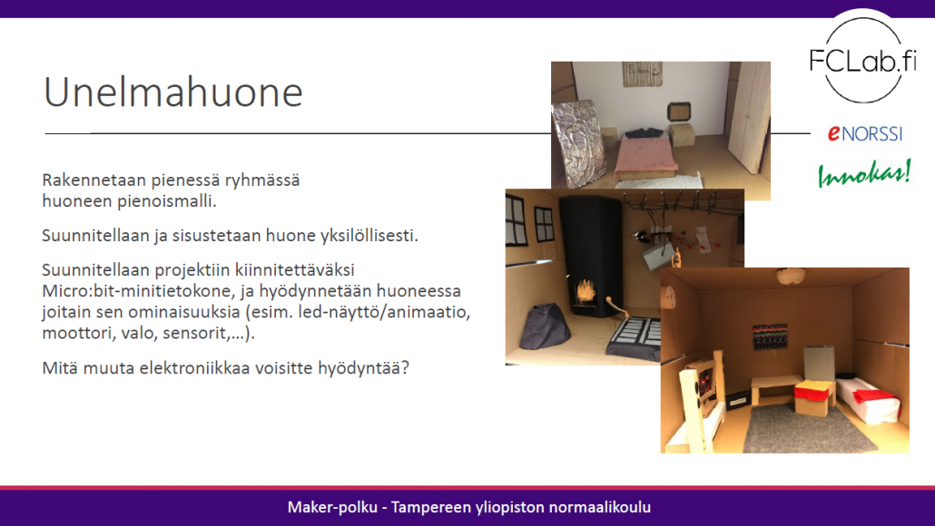 – Suunnitellaan projektiin kiinnitettäväksi Micro:bit-minitietokone, ja hyödynnetään huoneessa joitain sen ominaisuuksia (led-näyttö/animaatio, moottori, valo, sensorit,…).