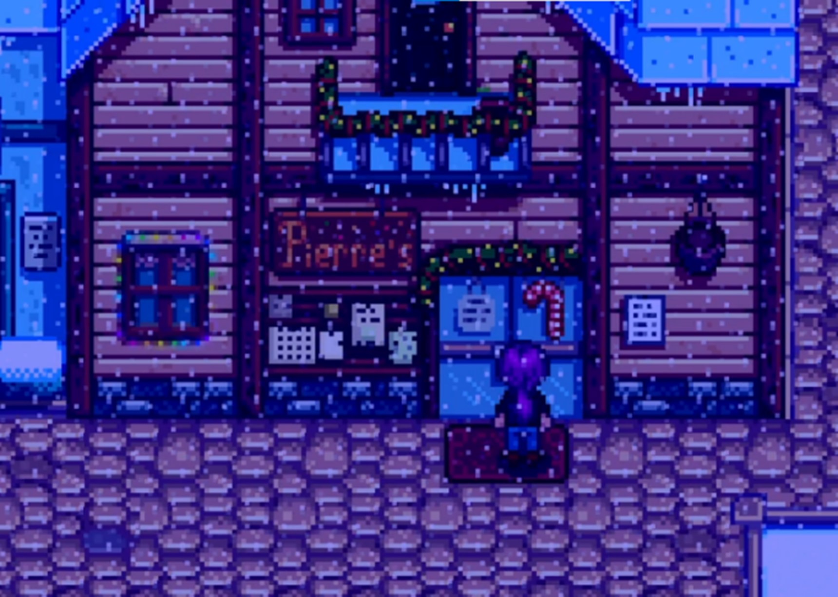 I cut across the Community Center yard; everyone in the valley seemed to be sleeping as usual. My black T-shirt, the one I got when I was created, is already wet from the snow. The wind whistles in my ears when I arrive around the corner of Pierre’s shop—the shop that has been in trouble since the arrival of JojaMart. Lately, it has felt like this new corporation absorbed the last bit of vitality from the valley, and now it’s downright withered in place. Everyone knew it would be that way, but I guess we all still hoped people would realize how much harm it does to all small business owners and start doing their shopping elsewhere. Pierre has decorated the shop with beautiful Christmas ornaments, and although I can’t smile, it’s almost as if I could feel a warm hug spreading all over my chilled, pixelated body.