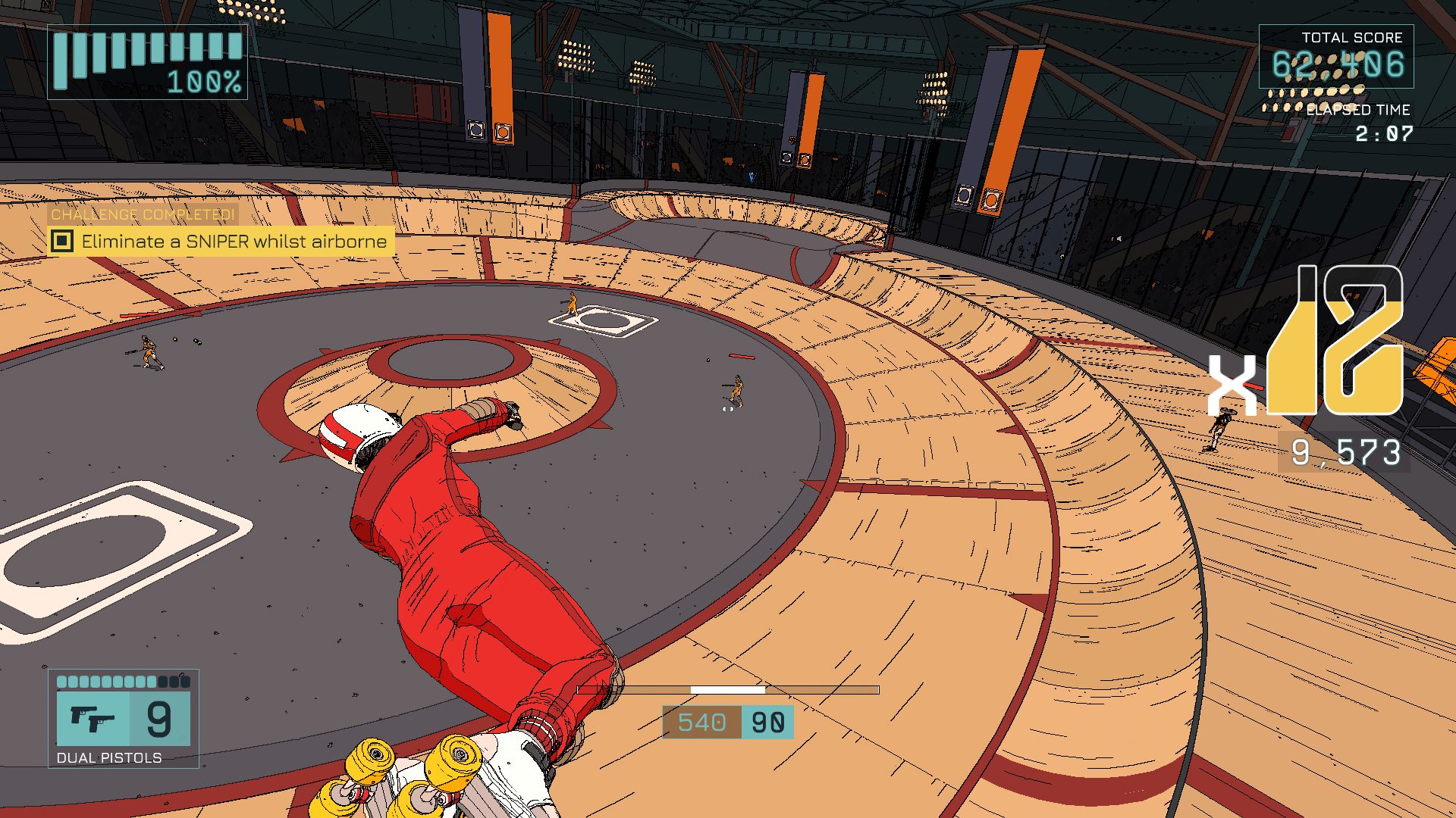 The fun movement does have its’ unfortunate quirks too, such as unexpected bouncing and changes in momentum here and there. Displaying un-skateable areas could also be better, as accidentally touching out-of-stage areas leads to a lost combo, and bumping into an unrideable wall usually ends with me comically falling to my death. At least the game doesn’t allow tricks to ‘fail’: you always land back on your feet no matter how you hit the ground. In an arena filled with land mines, sniper fire, missiles, and a running combo timer, it’s a real blessing.