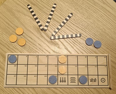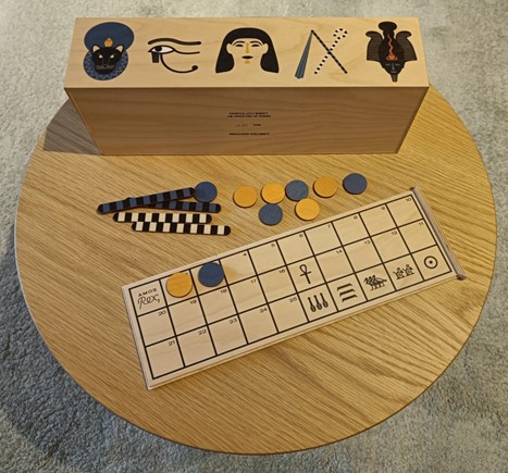 Senet is the first known board game, or at least the oldest that we know about it, with the first boards indicating over 3100 BCE years old. The basic rules are simple: in a 30-space board, the first to reach the last space with all their five pawns wins; you throw sticks to determine how much you can move and there are five special houses in the board. Well, that is not quite correct. The rules of Senet are not known for sure. What we know are deductions based on boards, pictures, and archeological relics found. We played a limited edition from a museum exposition (Amos Rex) but you can find different versions with slight variations of the rules.