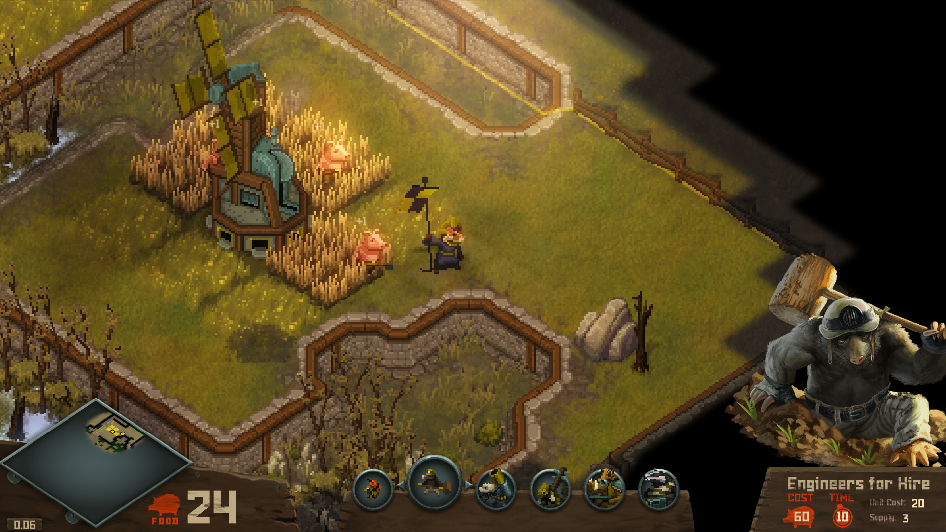 The game is set in a world controlled by talking human-like animals walking on two feet. Sounds cute, doesn’t it? Think again! The story begins at the onset of a revolution and the prevalent status quo is in danger. The animals have been divided into four different factions, all of which are armed with their own ideas of governing. More importantly, all four factions have their own idea of how to determine who gets eaten. That’s right, the talking animals of Tooth and Tail are almost without fail carnivores, and the world struggles with constant food shortages. The poor folk on the menu are often fallen enemies or pigs grown into slaughter. The absurdity of the narrative is fascinating and entertaining, and the dark setting is matched well with the various units in the game. You got your pistol-wielding squirrels, artillery-carrying ferrets, falcons with a minigun strapped to their belly, and owls spewing zombie rats, just to name a few. Though the dialogue produced by various animals in the campaign is mediocre for the most part, the story stands tall in its brutal absurdity.