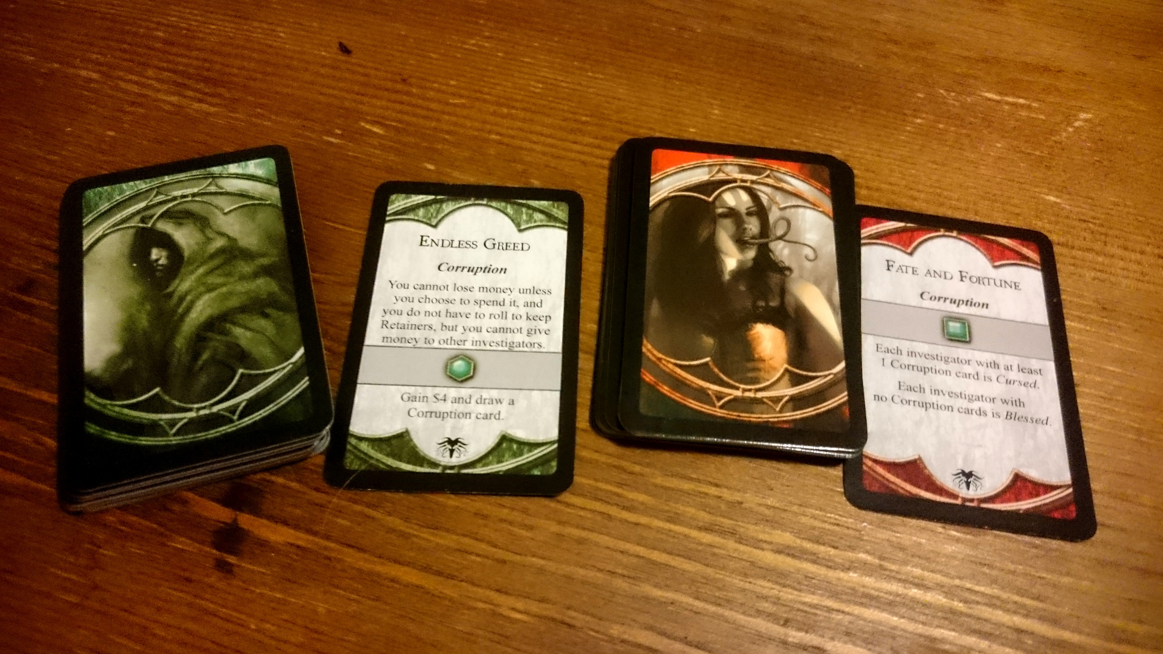 The players are forced to take corruption cards when defeating certain monsters on the board, and said monsters never run out. This time the players must consider which monsters to kill and which ones to simply avoid, and the portals from which these monsters appear can never be permanently sealed as in the main game. One can also join the Herald’s evil cult to get intersting new encounters in certain locations on the board. The expansion also introduces new cards for ordinary encounters that take place without the cult membership as well as some new items that can be collected by the players.