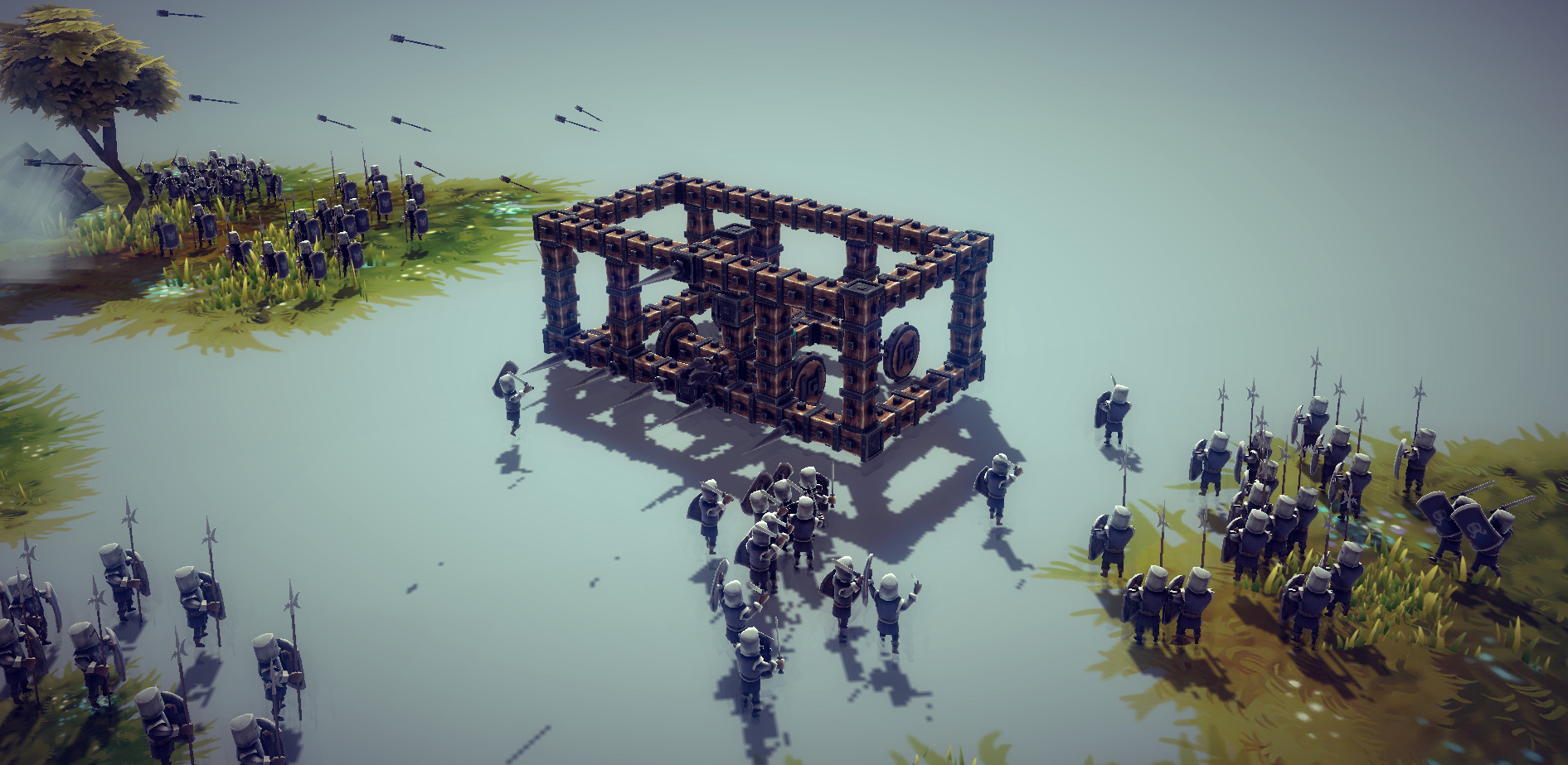 Besiege is a strategy sandbox video game developed by Spiderling Studios. In Besiege, the player creates different kinds of siege engines and machines in order to clear objectives, ranging from destroying defended structures to reaching checkpoints within a minefield. The levels are designed in such a way that it would be extremely challenging to beat the game with just one machine, as some levels require more firepower, some require more mobility, and some might even require the ability to fly. The game also has the possibility to create your own levels with a level editor, and the ability to play or host multiplayer games.