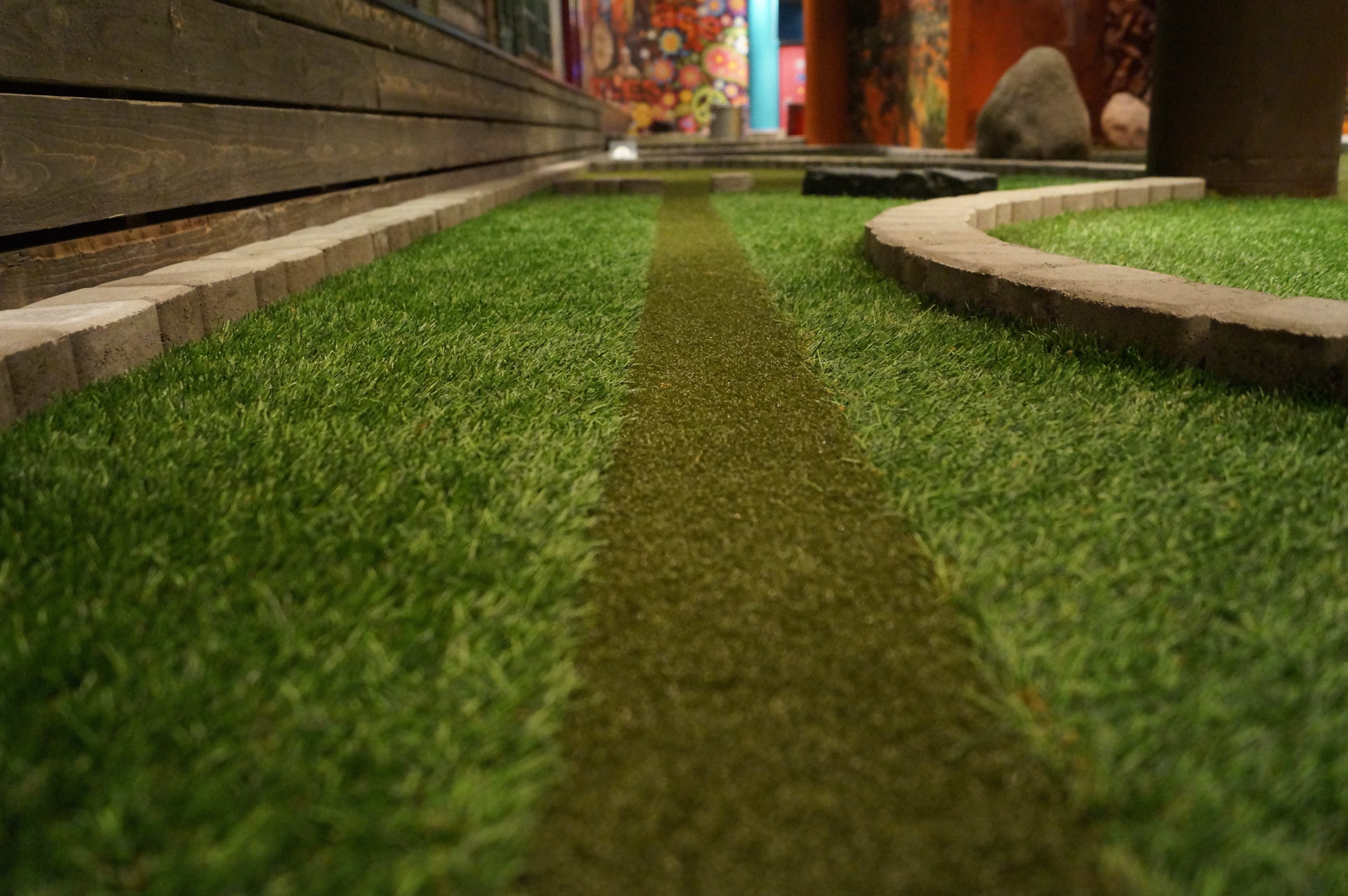 Ratojen matto ei ole perinteistä vihreää huopaa, vaan tekonurmea. Se on pieni yllätys minulle ja peliseuralleni ensimmäisellä lyönnillä. Palloa pitää lyödä hieman lujempaa kuin perinteisellä huopapohjalla. Niin kuin oikeilla golfkentillä, ratojen maasto on vaihtelevaa, ja niissä on myös pidempää nurmikkoa.