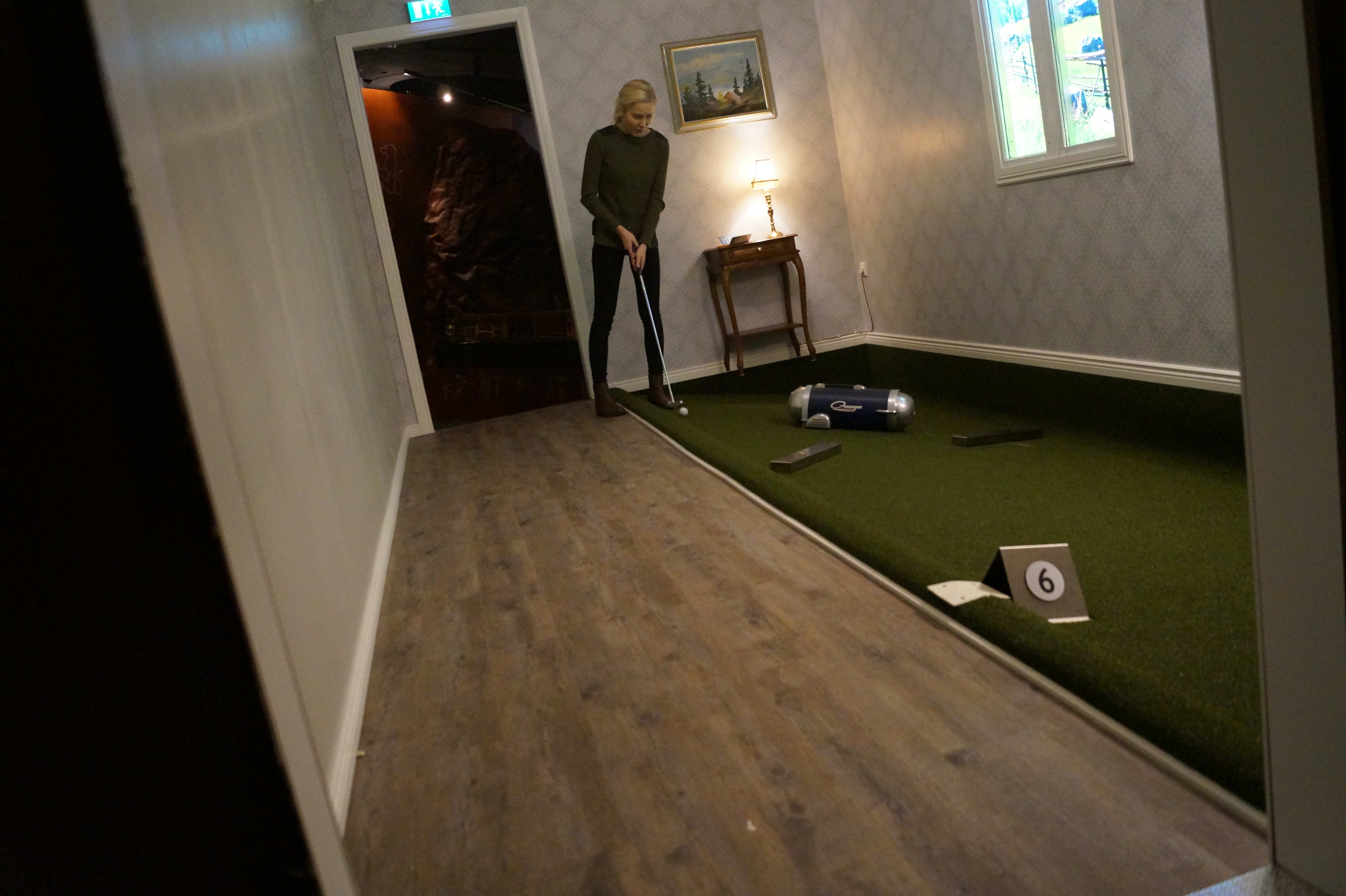 Rekvisiittaa ja tehosteita on selvästi mietitty. Muutamalla väylällä on reikä lavasteessa tai seinässä, josta ei ole ihan varma, kuuluuko pallo lyödä niihin. Lopulta emme uskaltaneet kokeilla.