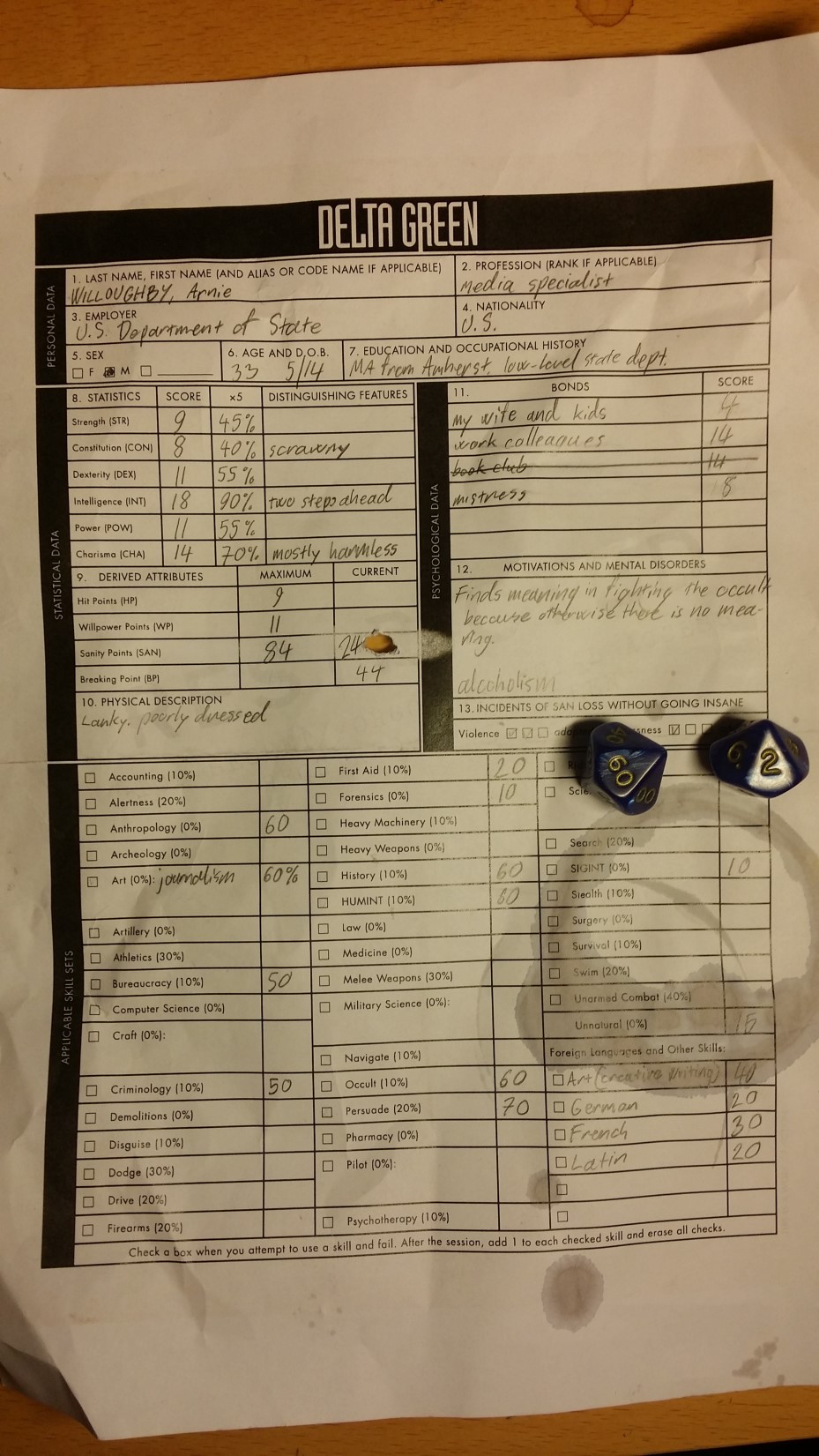The game is one part spy thriller, two parts horror. The player characters are agents who need to keep up appearances at their day jobs and personal lives while secretly fighting the good fight. One part of the horror is the cults and monsters. The other is the fight’s impact on the agent’s psyche, their family, their belief in everything they fight for.