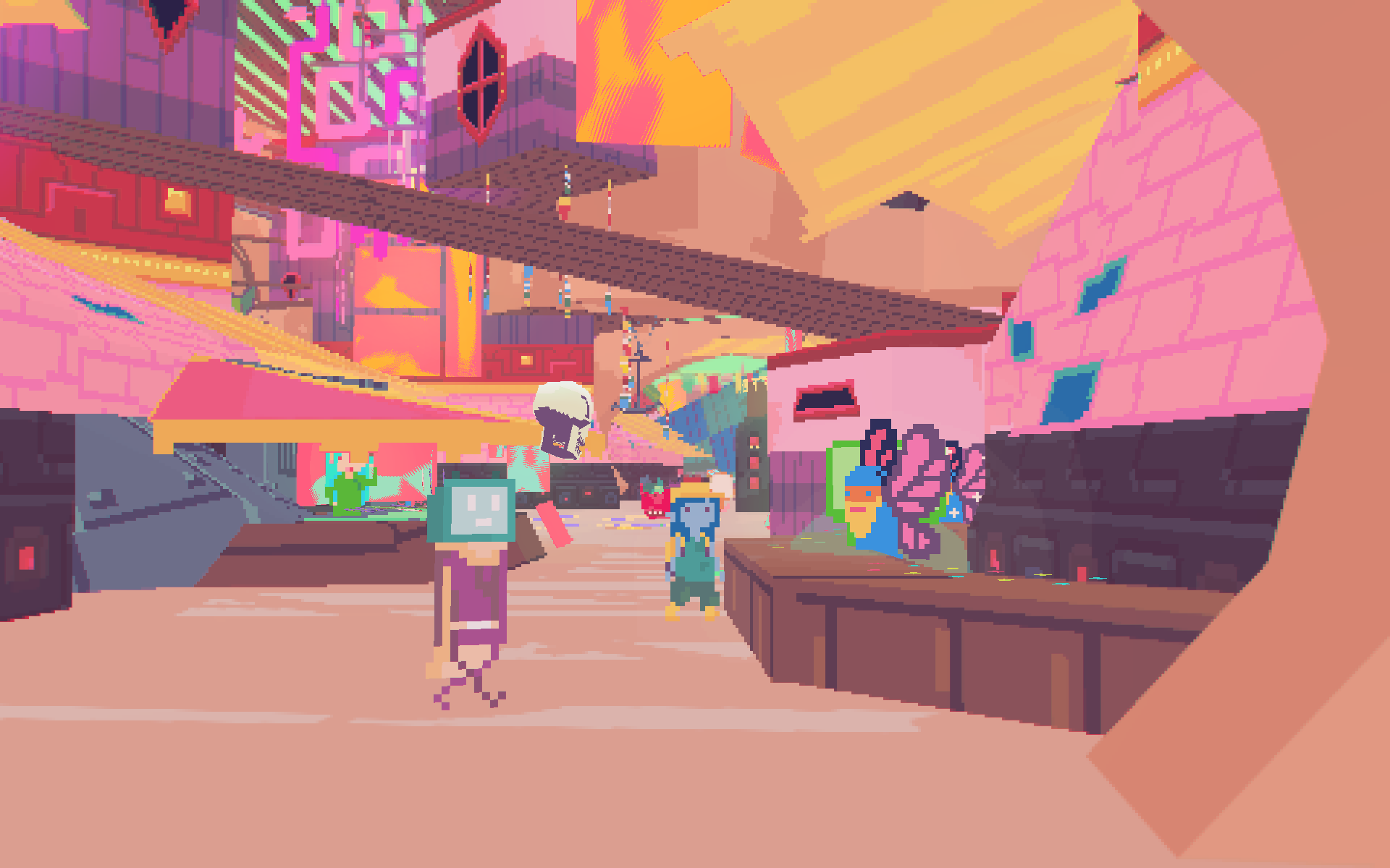 The Space Janitor as Player Hero was a staple in certain mostly terribly dated 1980’s computer games, from Infocom’s Planetfall to Sierra’s Space Quest series, but the wild potential of such custodial roles has been barely touched upon since. Spaceport’s influences are of a thoroughly more modern bent, with writing evocative of Porpentine’s lush, lurid hypertext work and a three-frame animation style that is recognisable to most fans of thecatamites. The game is ultimately its own wonderfully idiosyncratic thing, with everything feeling hepped up on beeps and boops, neon and fuschia, till it’s hurling particle effects and distortions all over the tightest little open-world hub you’ve ever seen.