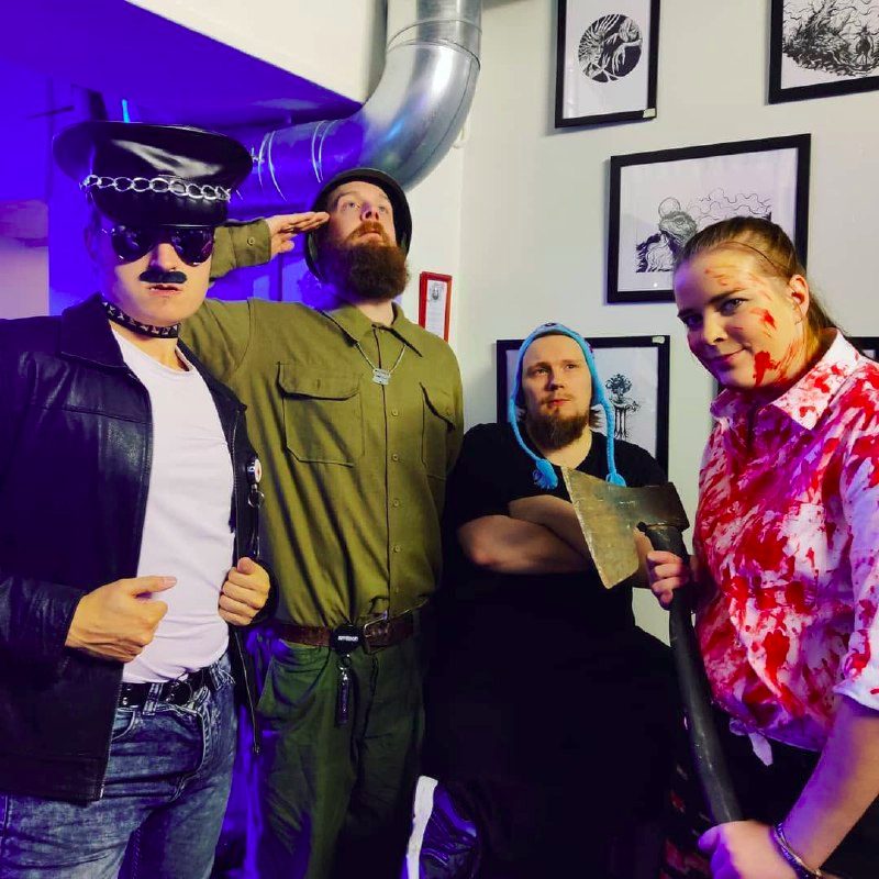 Four people dressed in various goofy halloween costumes. On the far left is a YMCA sexy cop, the next left is a bearded soldier man, the next left is a man in a beanie and the furthest right is some kind of axe murderer