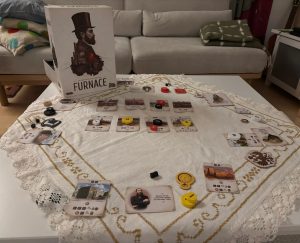 Furnace (2020) is another capitalism themed game. In it, players take on roles of 19th century capitalists: They build their industrial corporations and aspire to make as much money as possible by purchasing companies, extracting resources and processing them in the most optimal combinations. There are two phases in the game: Auction and production. In auction phase, players bid on available factories. Losing the bid is sometimes strategically sound, as this results in ”compensation” – which means that the player who lost the bid gets resources right away. In production phase, the actions in the factories activate. Some give you resources, some help you process them into different ones, some help you upgrade your factories, and others turn resources into money. These two phases in this order are considered one game round. After four rounds, the game ends and the player with the most money wins.