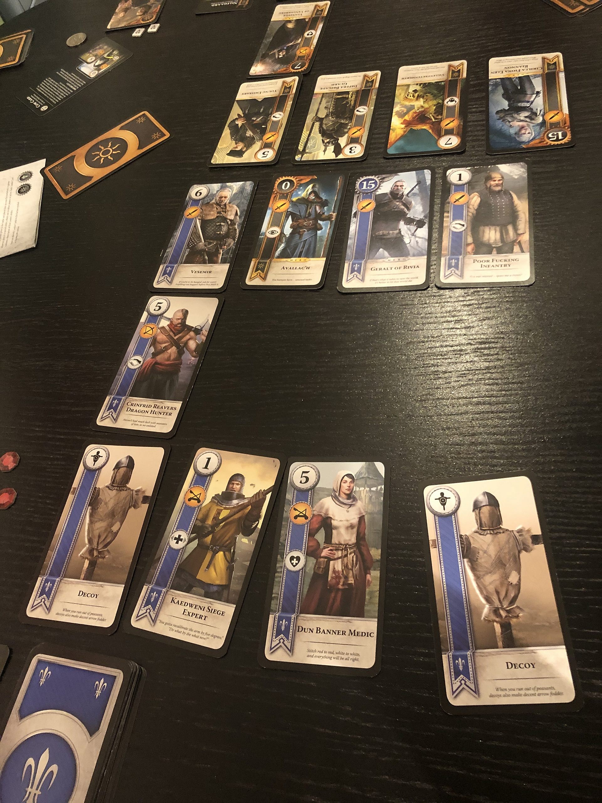 Building the deck isn’t complicated in Gwent as it isn’t a very complicated game. However, it doesn’t mean that you couldn’t utilize your strategic prowess. The rules sheet give the idea for the basic deck and while there is not too much to choose from there is enough for versatility. The deck will consist of 1 leader card, at least 22 unit and maximum of 10 special cards and a hand is limited to ten cards.