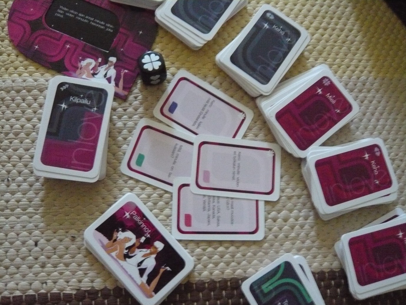 The biggest problem in the game is that in cards there’s a huge misprint with one color shade, the light pink has somehow printed to be light green! It’s confusing and I hope it doesn’t appear in any other copies of the game than Finnish version. I would note that the game gets boring easily because it uses the same kind of tasks just in different aspects and course is over fast if you really know your partner well. For a romance point of view there are probably better games to spend a romantic evening with.