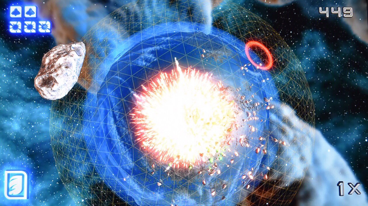 The goal of the game is simple: defend your spacecraft and the planet below from alien attacks and asteroids. Basically, destroy everything in sight. You have the choice of switching between three distinct weapons each made for mining a different type of asteroid. Each level is set on a different planet and has five waves of attacks and a boss fight against a large alien spaceship.