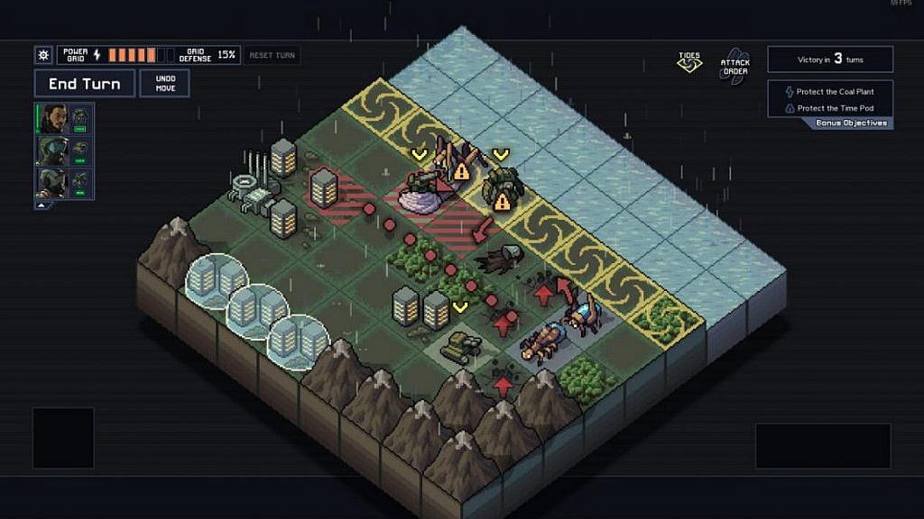 As stressful as they are, those difficult situations are also the main attraction of the game. You start each turn looking at a hopeless puzzle, yet you pull through and feel like a genius for doing so. Even if it seems impossible, there is always a correct play that turns the tide, or at least holds it back for a moment. It’s no shame to win via timeout, since every mission last for only a few turns, and every objective other than survival is just an added bonus. It’s not your mechs that you’re supposed to protect though, since your campaign health bar is counted in civilian casualties.