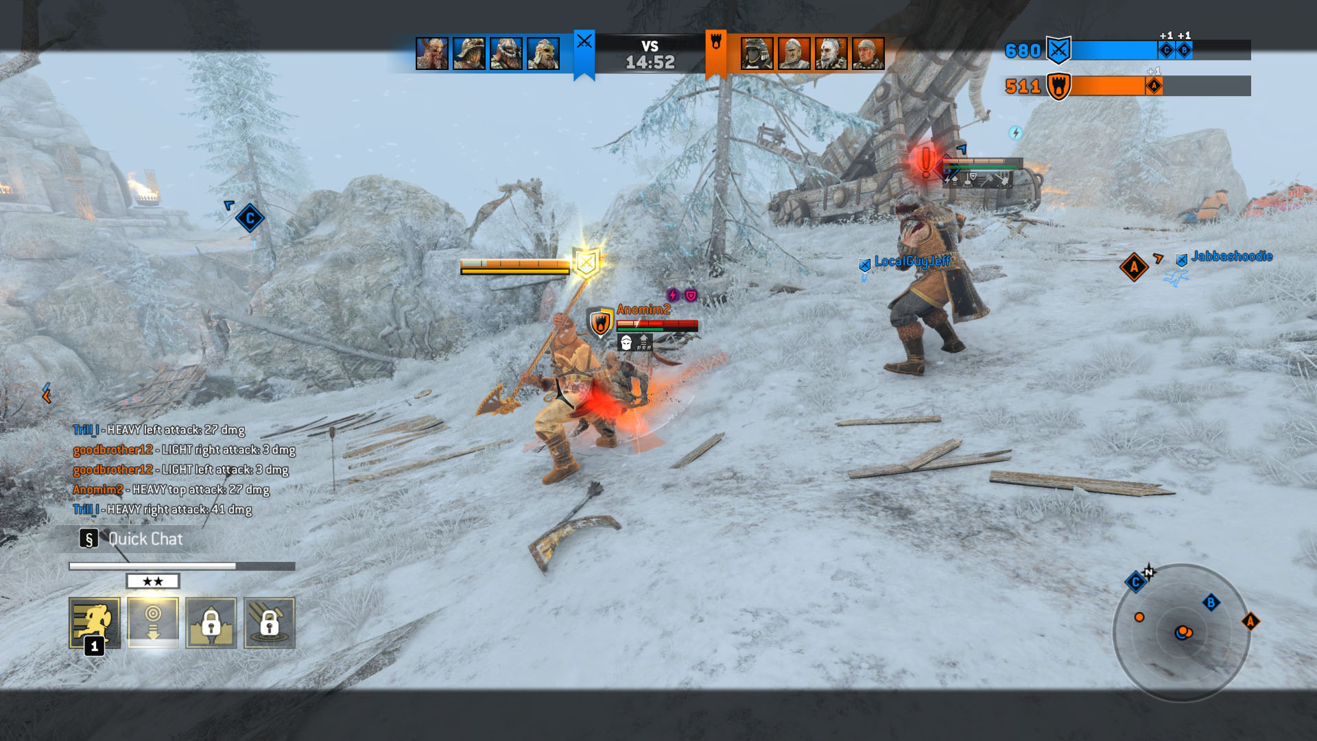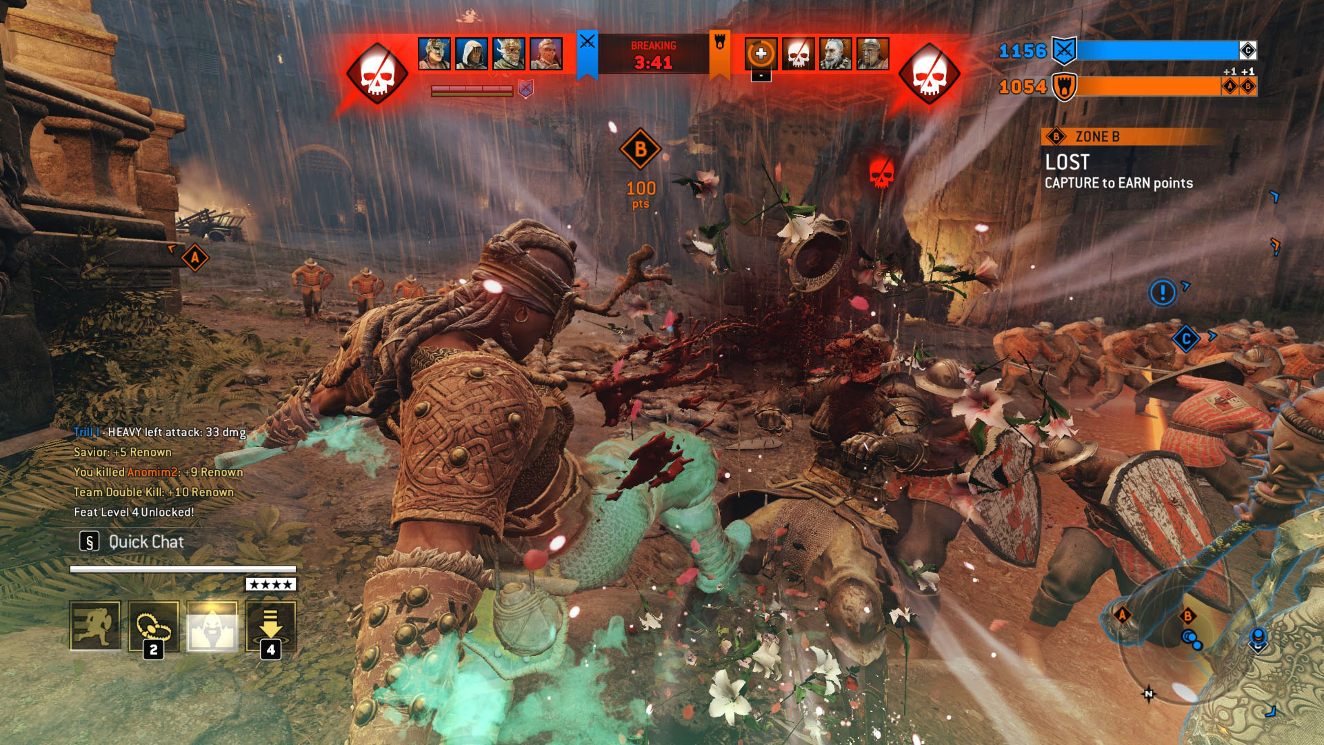 For Honor is hard to master. While duels are less complex than in some fighting games, 4v4 offers interesting, though often asymmetrical brawling experiences. Game modes include capture-the-flag, deathmatch, and even sieging a castle, mixing in non-player soldiers as cannon fodder. In practice, however, finding players for anything but the most popular capture point game mode is slow.