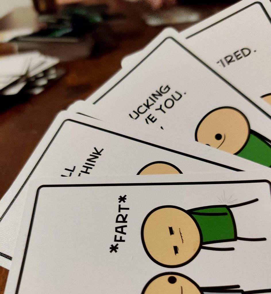 Since the two characters are always on the cards, the number of cards that fit the dialogue on the cards on the table can be reduced to only a couple of options since having the same character responding to a question set on the previous card would come off as confusing and not funny. Luckily the non-verbal cards come to the rescue, since if there’s no fitting cards, peeing on someone is always a funny choice.