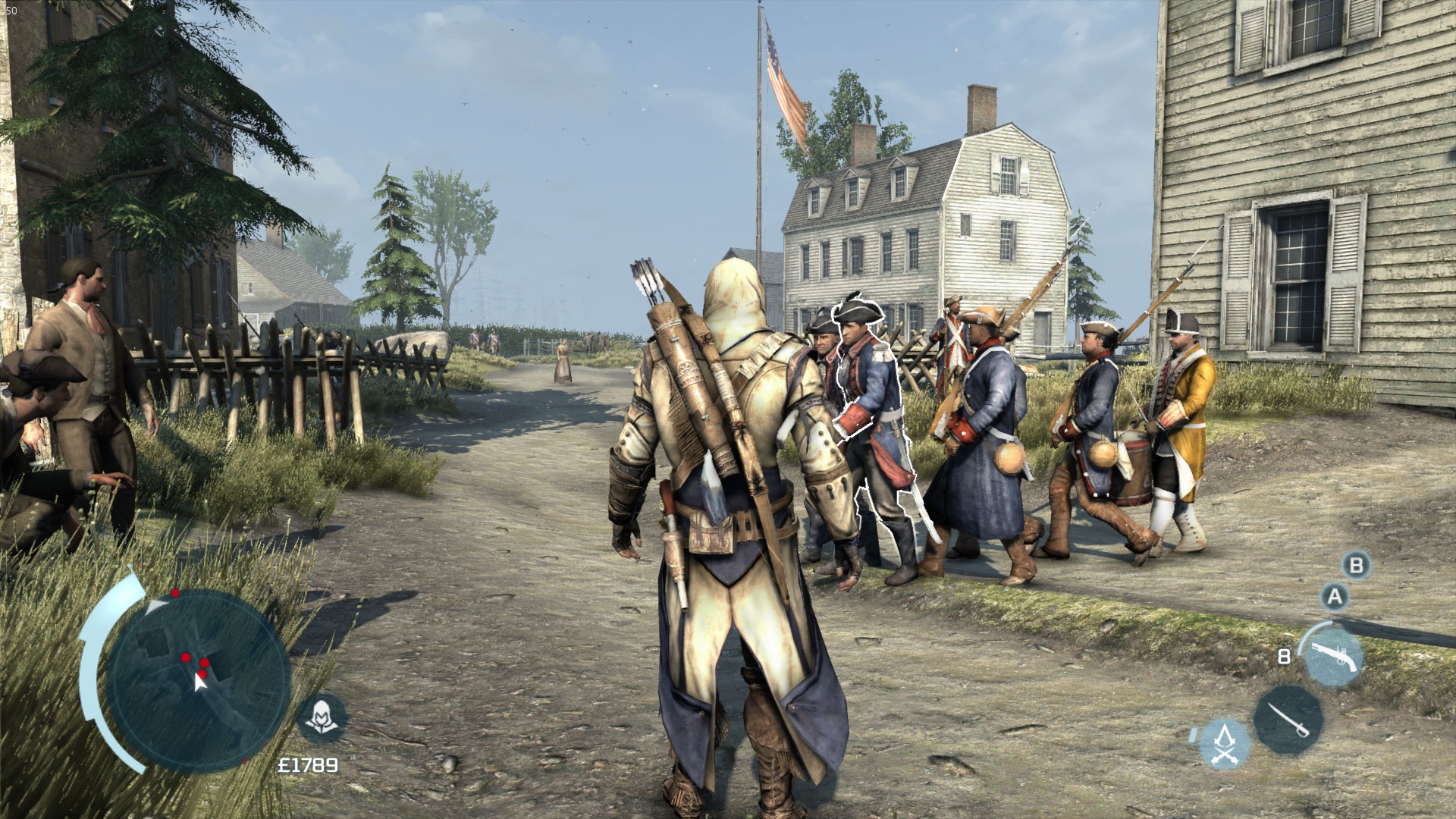 Assassin’s Creed 3 (Ubisoft) takes place during the American Revolutionary War. However, the war is not necessarily central to the game experience, serving mostly as background context. A screenshot.