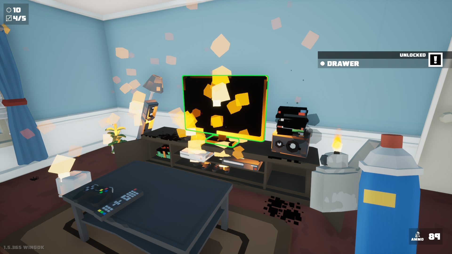 And there will be chaos. But don’t worry, Kill It With Fire does also have some structure. During the levels, you have different kinds of objectives to complete. You carry a handy clipboard that displays these and doubles as the starting melee weapon. Tasks can be either found in the level as sparkling papers or you can just try to complete them blindly. None of the objectives were very hard and it was fun to accidentally complete some while messing around in the game.