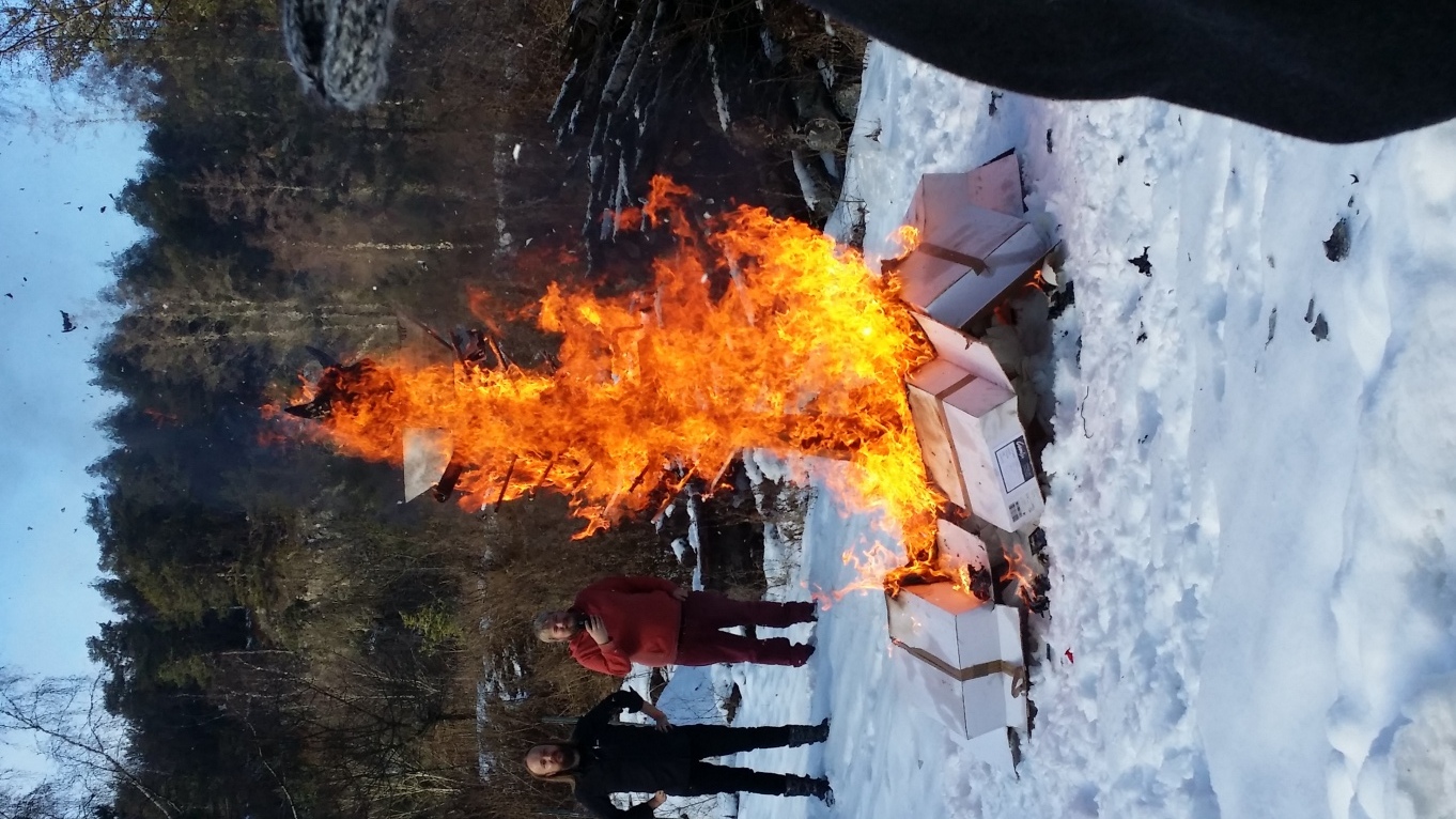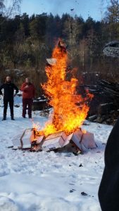 At the opening ceremony, there was a ritual – Norwegian larpers are big on rituals – commemorating each of the conferences, centred around a totem pole. The pole was then placed in the hotel lobby and the participants invited to place some small token from a memorable past conference on it. At the closing ceremony, the totem pole, festooned now with badges, program leaflets, song lyrics, even one entire book, was ritually burned in the hotel yard.