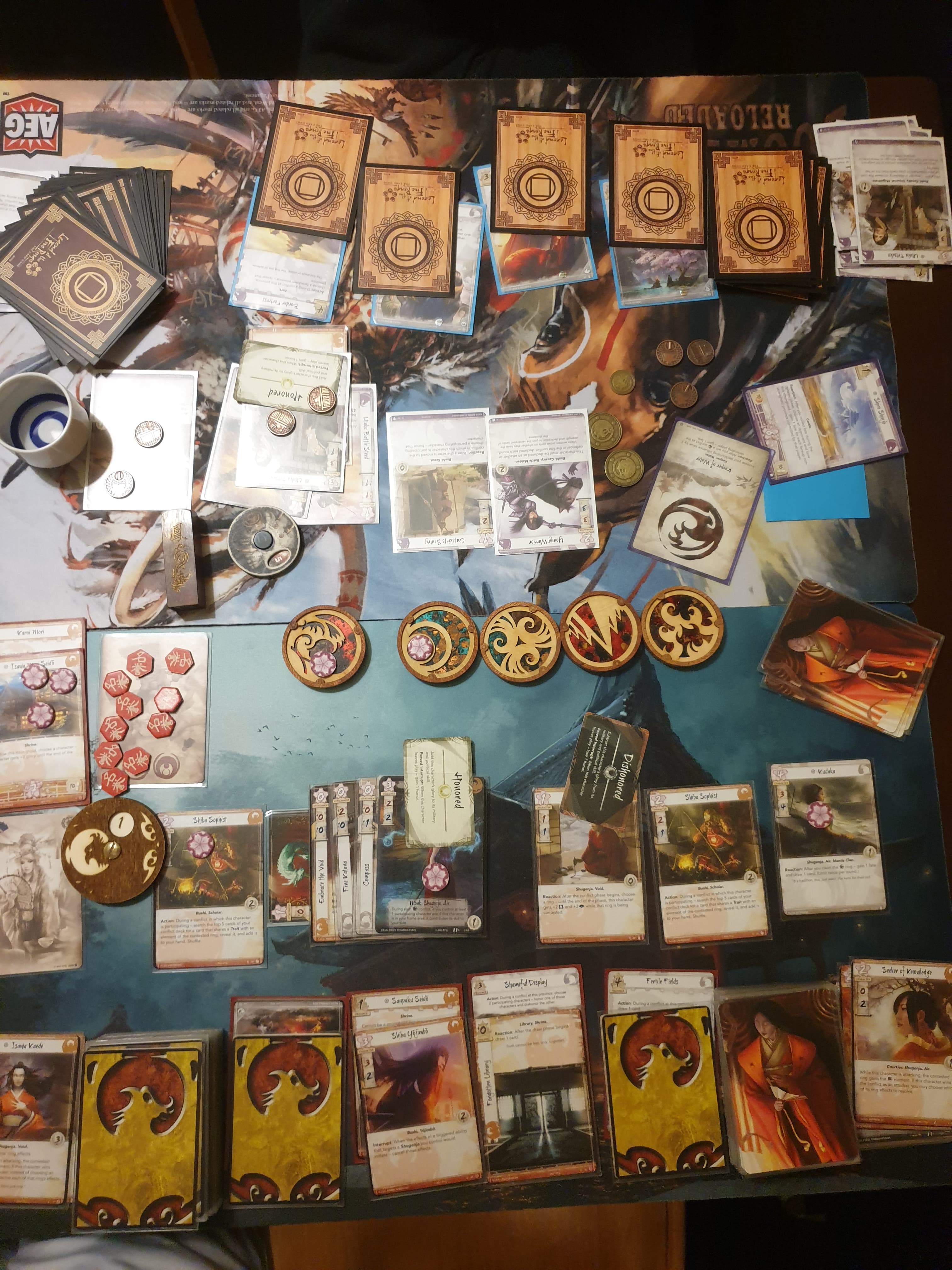 An ongoing game of L5R, the five elemental rings can be seen in the middle
