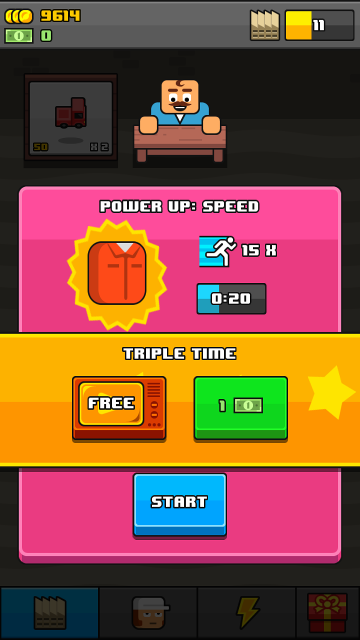 You can have up to nine workers in each factory, all hand-picked by you from a bunch of caricature candidates. They will be producing goods until their workstations are full, and emptying them will fill your pockets with money. You can spend your hard-earned cash on improving the speed of your workers, tapping efficiency or work-station capacity. You also need money to build more factories. On the factory screen, you will often see floating power-ups, which either give you money or short, powerful boosts that quickly fill your coffer.