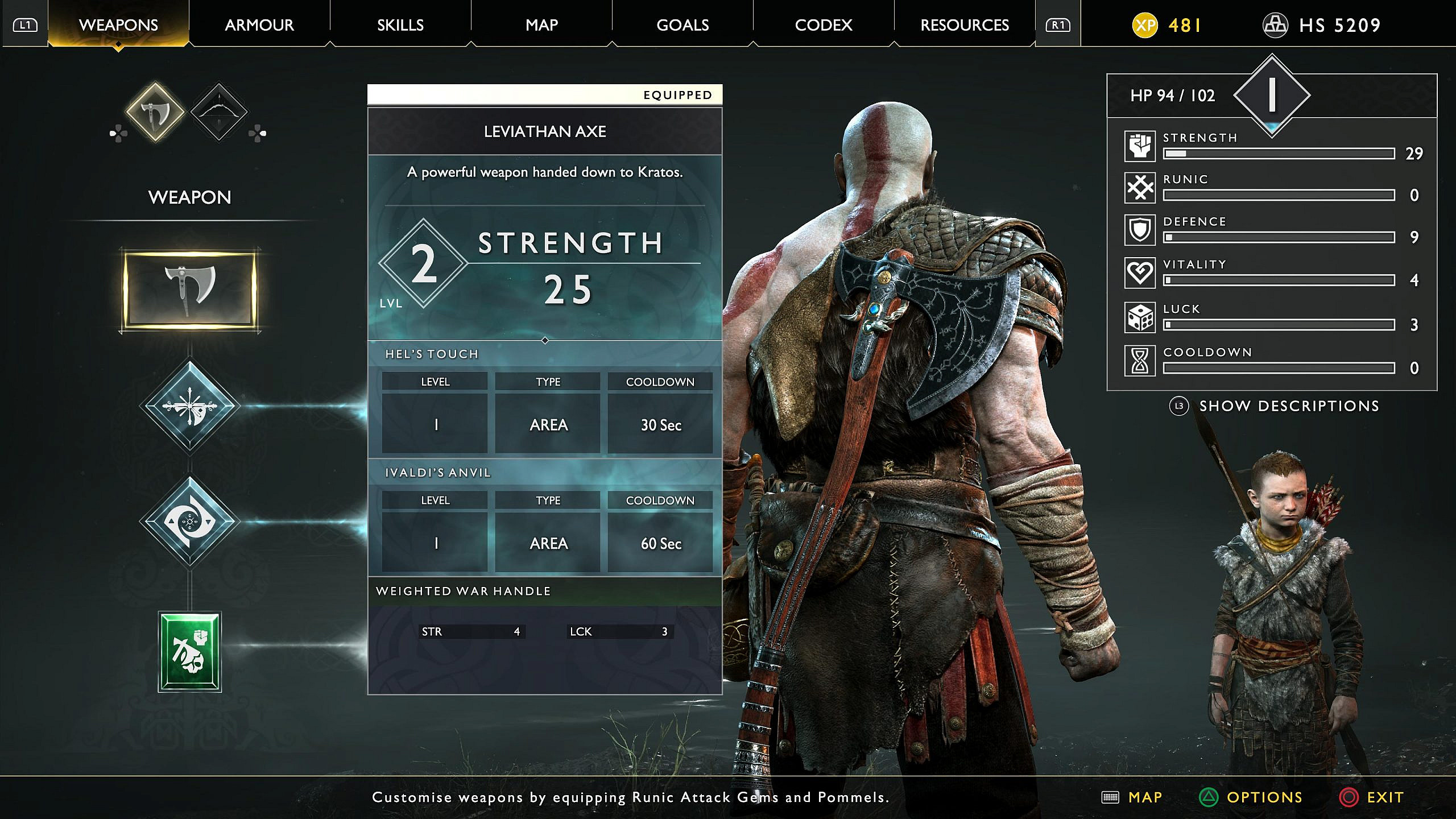 The equipment system leaves me immediately reeling in my chair. The menus blast you with countless stat numbers for your character and the equipment, whether you’re examining your armor or weapons. Complexity is also added by splitting armor into three different components, with upgrades for each component in addition to enhancement sockets that also alter stats. Weapons also can be upgraded and modified with runic attacks and weapon pommels that also have their own upgrades. If all of this wasn’t enough, some of the same things apply to your companion Atreus, who has their own weapon upgrades and armor.