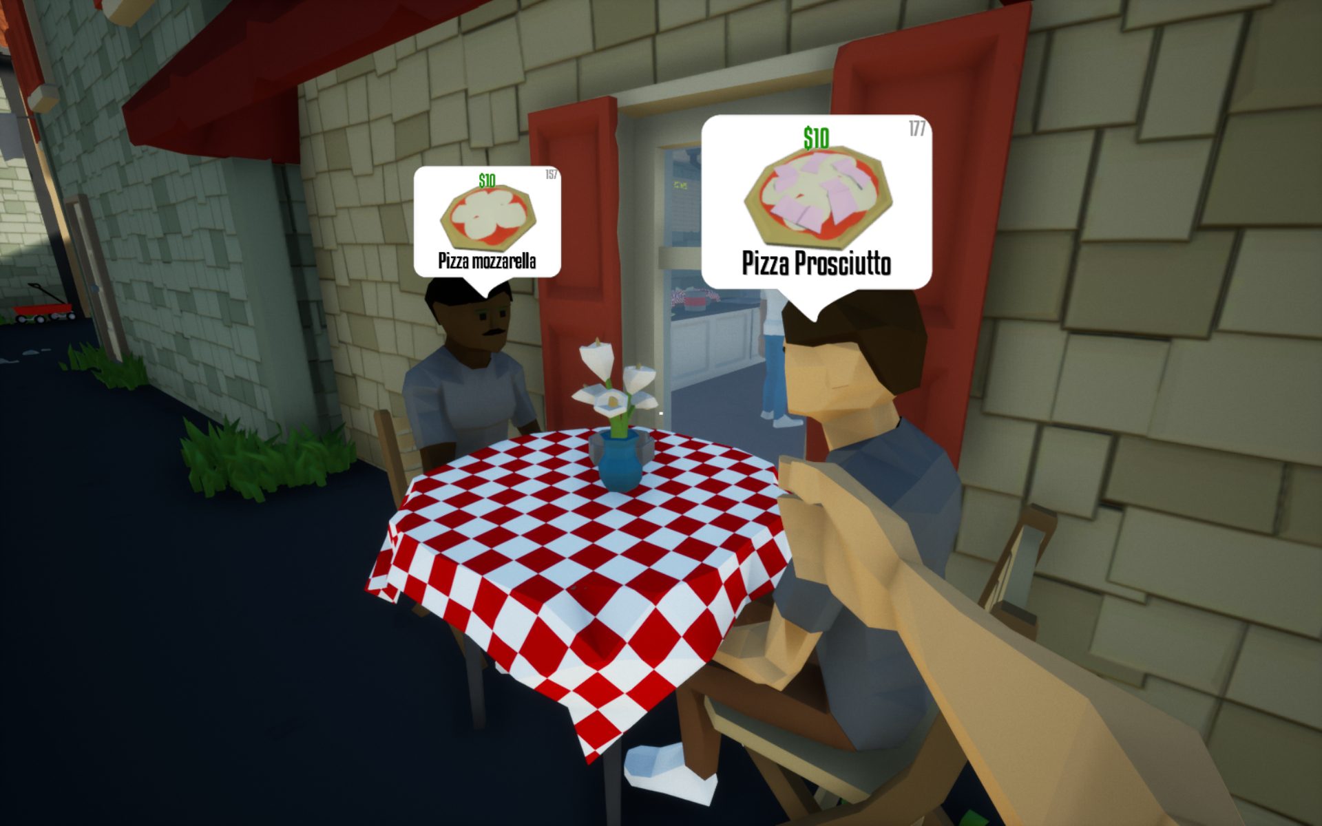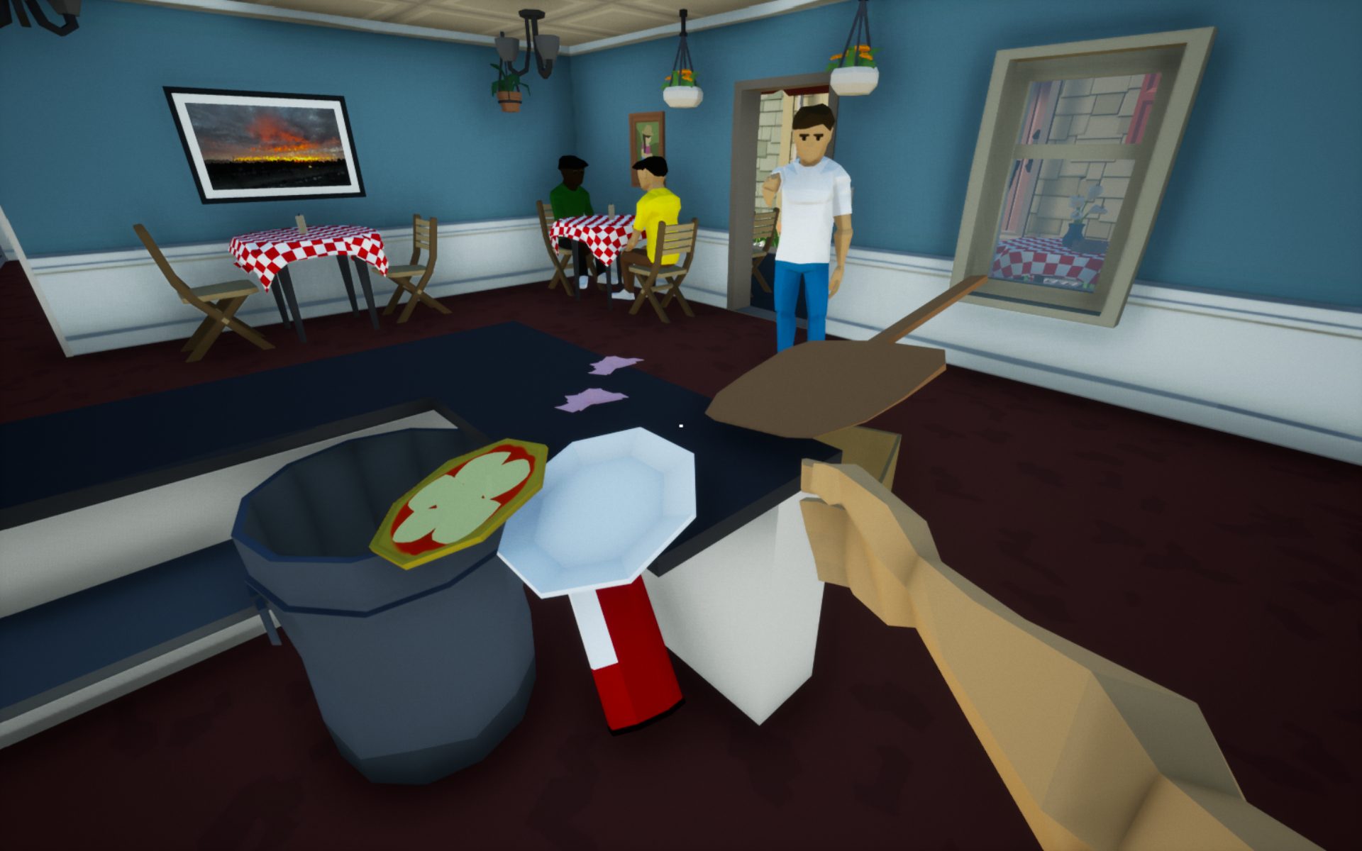 The gameplay itself isn’t so smooth, which is meant to be a part of the game. Everything has its own mechanics in the game, often defying gravity in some way. For example, with just a small touch the plates can fly all over and then get stuck in the roof. This leads to, of course, the clanking sound constantly coming from over your head. Placing things down or holding them the right way is also made difficult. It’s not uncommon for everything you had on the plate to spread around or things to fall way too easily. When you have to order more tomato sauce for the pizza after your friend knocked the can over the third time, you start to question whether you should play the game at all, or if you should get a different friend instead.