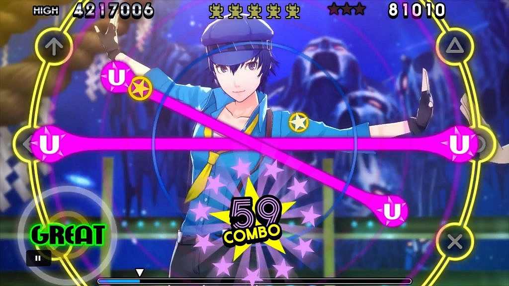 The controls are simple with both sides of the screen having three buttons markers. On the left, there are: Up, left, and down, while on the right, there are: Triangle, square, and x. The notes come from the middle, and buttons have to be pressed in the rhythm when notes are over the markers. Alongside ordinary notes, there are hold notes, where buttons have to be held, dual notes where two buttons have to be pressed simultaneously, and scratch rings, where the player must either move sticks or use a touchpad. The mastery of these controls is required for harder difficulties as the situations get easily hectic, especially if difficulty modifiers such as disappearing notes are used. The buttons markers placement on both sides, however, takes time to get used to if the player’s tv is large. It is no problem if played on PlayStation Vita, the game’s original platform.
