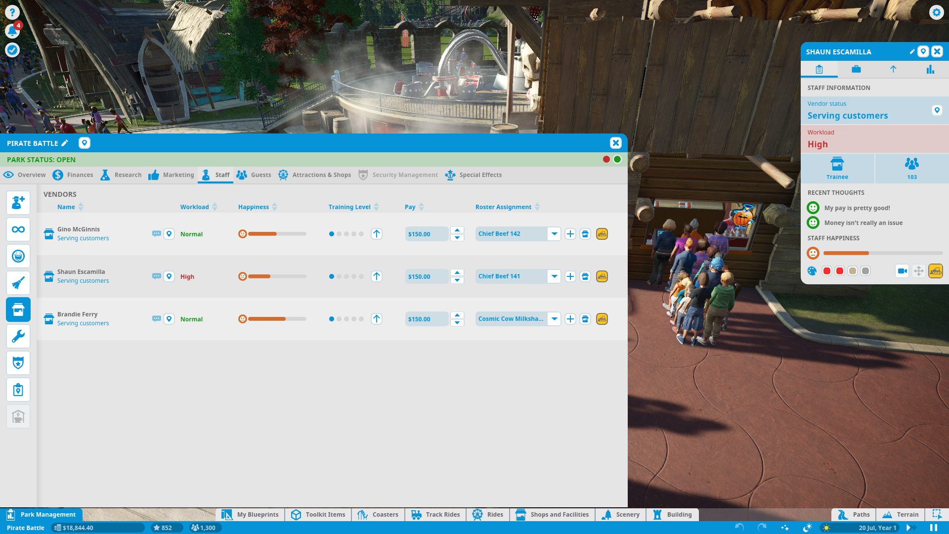 The base idea is to create rides to attract customers to your park. Customers buy tickets to the rides of your park to ride them. Customers also have needs to other things than just enjoyment. There are different food-, drink-, balloon-, and gift stalls to keep your customers happy. These stalls and rides don’t work by themselves, so they need vendors to keep them open. In addition to vendors, your park needs some other workers too to keep your park good-looking and safe: janitors to clean the park, security guards to stop thieves, mechanics to repair rides, and entertainers to entertain customers. While managing your workers and rides, you can also manage research to come up with new rides and decorations. When you’ve collected enough money from your rides, you can expand your park more by buying more rides and staff. Be careful with your money, because all rides age and some workers might quit, which may make your income turn around.