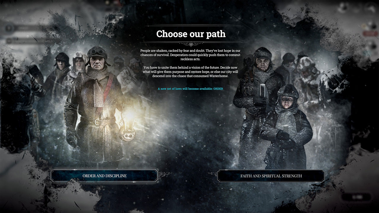 I recently finished my first playthrough of Frostpunk, a new city-building survival game by 11-bit Studios, the developer of This War of Mine, also a survival and strategy game. As is the case with This War of Mine, gameplay is highly focused on resource management in Frostpunk. As a mayor, the player character starts out with a small group of survivors, workers and engineers, as well as small caches of supply for building the city. The game is set in a completely frozen world and one of the ultimate challenges is surviving the great storm. In the meantime, the player manages the level of discontent and hope of citizens in what constitutes a democracy through, for example, establishing laws. If not properly managed, the level of hope and discontent may threaten the productivity of society and the rule of the mayor.