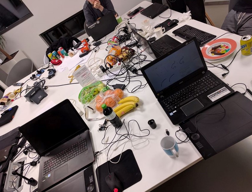 Well, it might be, but still, it worked. And pretty well, actually. The event started off on Friday evening as game enthusiasts assembled in the top floor of Kampusareena, where they would spend most of their weekend pushing the limits of their creativity – and most likely abusing caffeine, all for a good cause. The theme was shortly announced: Merge. This was followed by brainstorming, both in groups and individually, and soon a bunch of great ideas emerged, around which groups were formed: From one to seven people, each team was ready to face the challenge of turning that idea into a concrete reality. Not that we were left unaided before the huge task: Unlimited supplies of coffee, tea, drinks and then pizza and snacks got us through the following days.