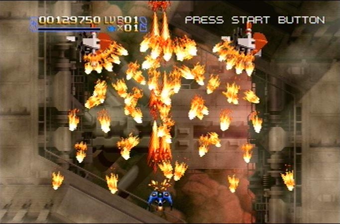 The genius of the game’s design lies within its scoring system. Unlike in many other arcade shooters, it is very integral to the core gameplay. All regular enemies are divided into three different colors: red, blue and yellow. You can chain a score by repeatedly killing enemies of a certain color. Doing so increases your score, which in turn levels up one of your three main weapons, based on which you were using. You can end up in a tough situation later on in the game if your weapons are insufficiently leveled.