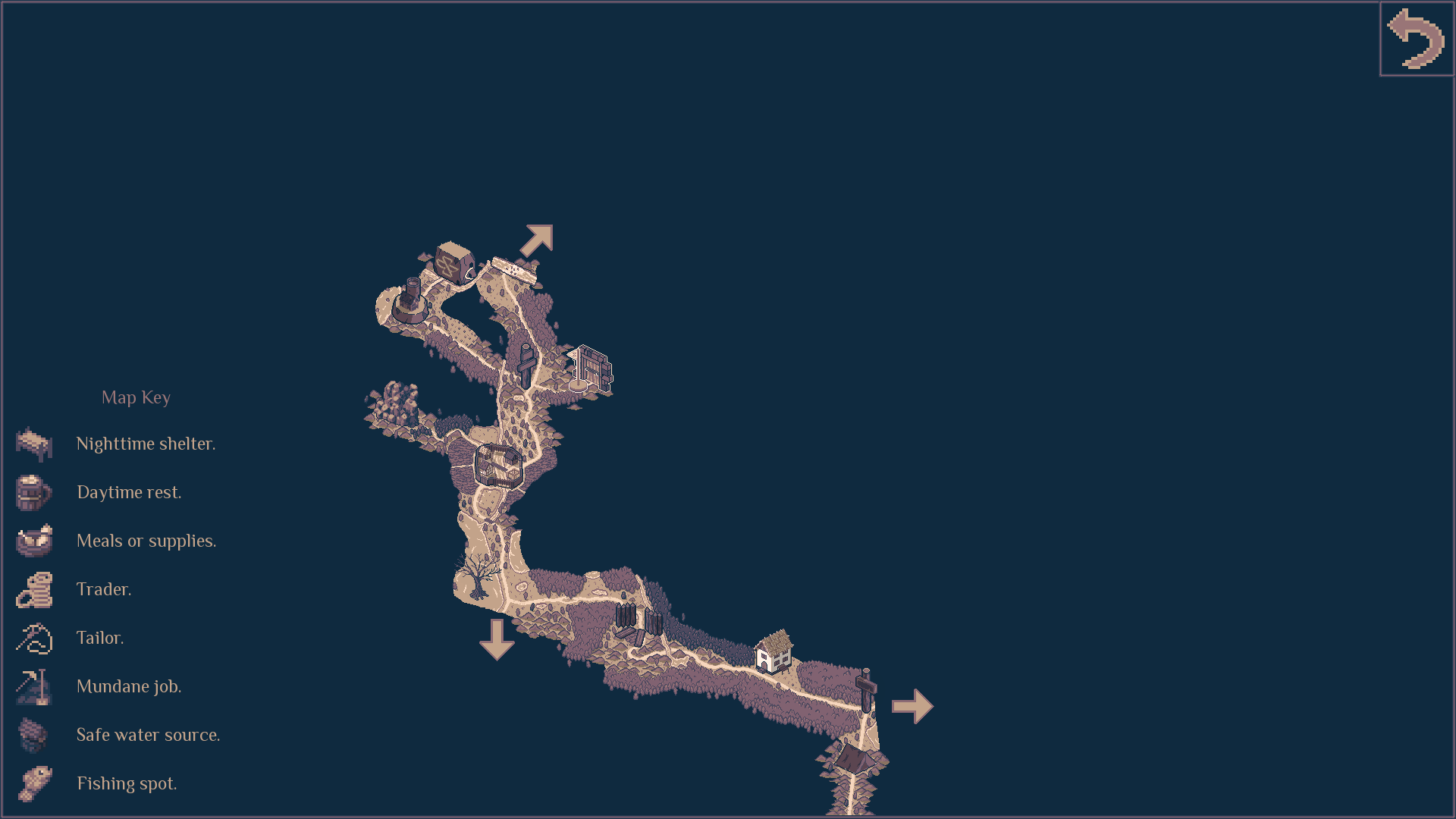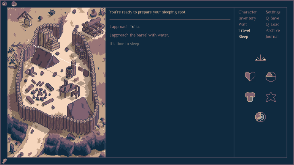 The moment-to-moment gameplay is simple. At each location, in the style of a visual novel, you are given a text blurb to read, after which you have some choices to make. This simplicity is balanced by other variables, however. Your roadwarden has only ´till autumn’s fall (depending on your choice of difficulty, from 30 to 50 days) to accomplish their mission and as you move on the game map during the day from location to location, time keeps ticking away. You also have some stats to keep your eye on – from health to hunger to cleanliness, which all affect what options you have available during your choices. Challenge does not feel overwhelming, but an aspect of survival in the unknown is always there and gives off the right feel of “adventure”.