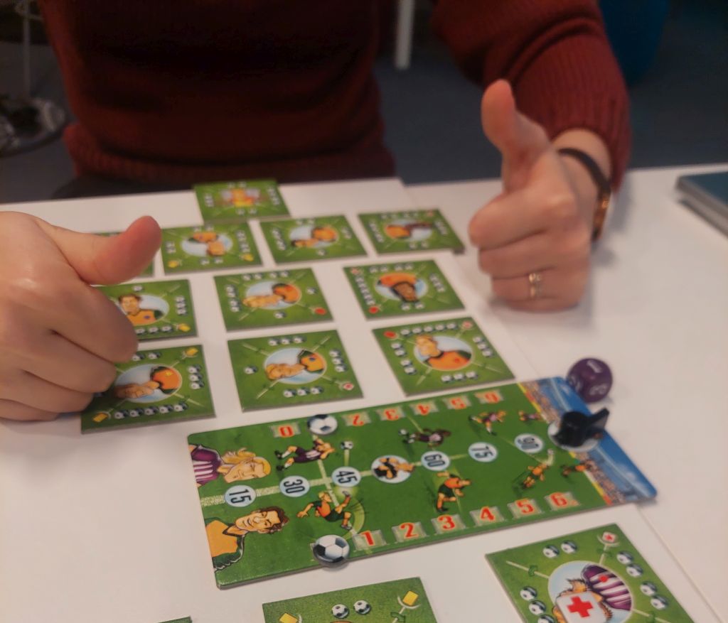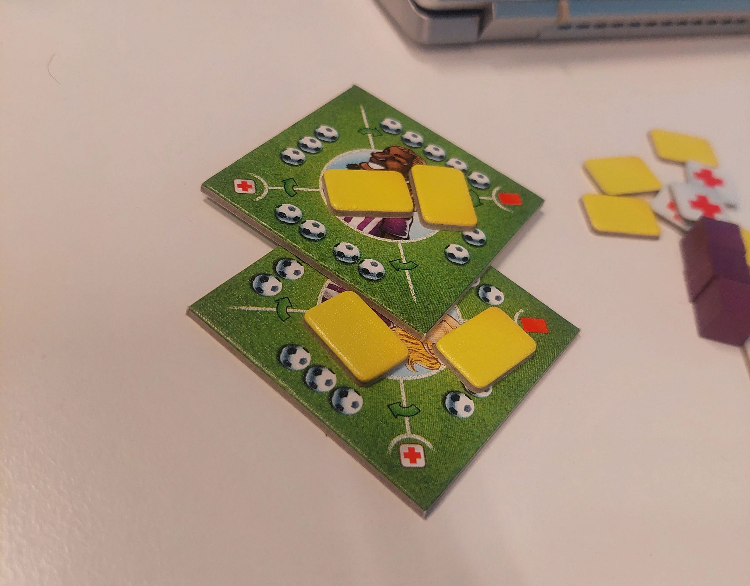 The theme is present in the greenish colour scheme, while the pictures on the footballer cards are cartoonish caricatures. In a welcome addition, the flipside of these cards also includes female counterparts. You can therefore even play a mixed match if you wish. One can complain that the player cards are always the same and the starting positions of them are fixed, but with more cards the game would be cluttered and longer.