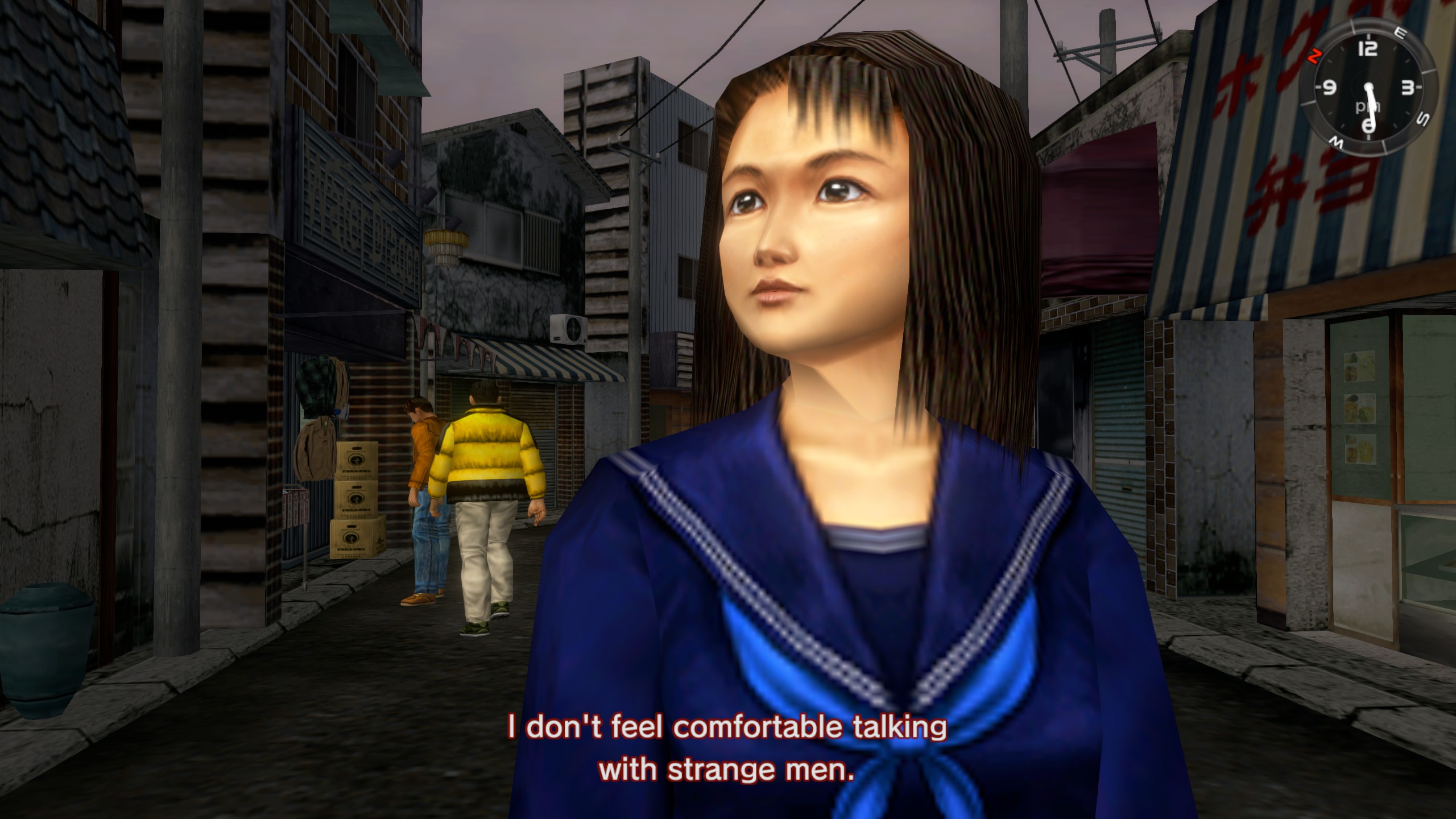 Shenmue puts great pride in its attention to detail, and shoves your face into every single item they’ve created for you. While I’m happy to praise the chap who spent hours designing the rolls of toilet paper, the crunchiness of 20-year-old textures places them in the realm of the abstract. This adds a dirty grit to the low-rent apartment blocks and tattoo parlours, but doesn’t have the same effect when the game is beaming about its barely visible panty-liners. Similarly, the voice acting has the charm of the 90s about it, i.e. it’s admirable that they tried, but it’s destined to be in countless Youtube compilations making fun of it.