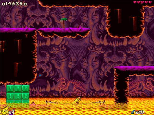 There’s a quote from Gameslice on the physical box of JJ2 that says: Jazz Jackrabbit is back in business for a sequel that one-ups every other platformer in existence. That, of course, might be a slight exaggeration on their part, considering Mario 64 came out two years prior. Indeed, the platforming is, most of the time, simplistic jumps over obstacles. But, added to that, there’s a dedicated run button, not quite Sonic the Hedgehog speed but still there, and several guns to blast your enemies with. It’s simple and it works, so that’s all that matters to keep it playable two decades after release.