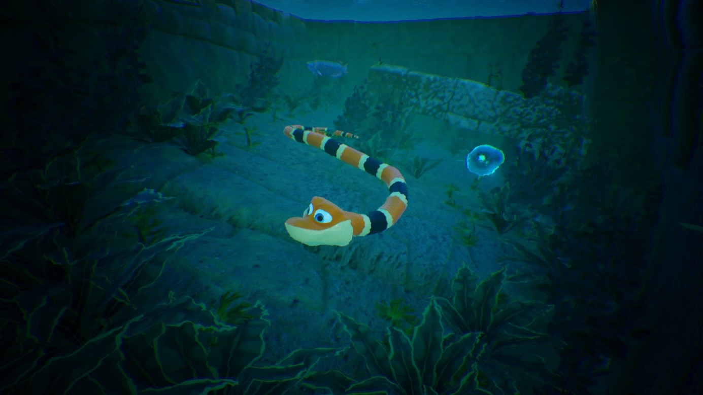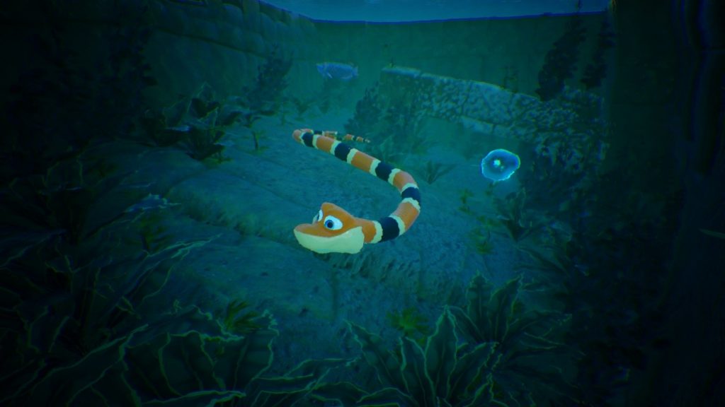 But if you are of the patient sort and feel that pang of nostalgia in your chest, Snake Pass has much to offer. The levels have a theme, gathering optional collectibles is fun and challenging, the soundtrack consists of exactly the kind of catchy light-hearted melodies you would expect, and the game doesn’t hesitate to whip out terrible puns of Crash Bandicoot-level infamy. (The four elemental deities in the game are named Bol-Dor, Sog-Gee, Cyn-Derr, and Bloh-Wee. See if you can figure out which is which.)