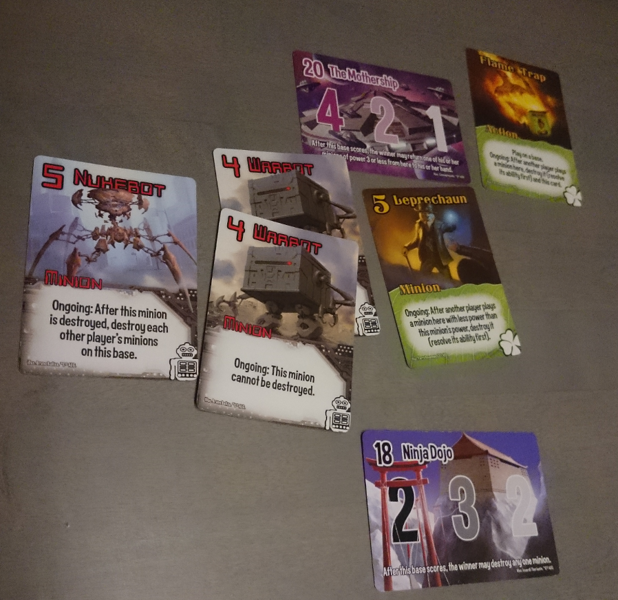 The cards in each deck are divided into minions and actions. Some minions are stronger than others, and many have special skills that can be used to surprise your opponent. Zombies rely on bringing minions back from the discard deck, while Ninjas try to strike when you least expect them. These cards may be boosted with actions cards that may allow you to play extra minions on your turn or from preventing your opponent from playing certain cards on a base, for example.